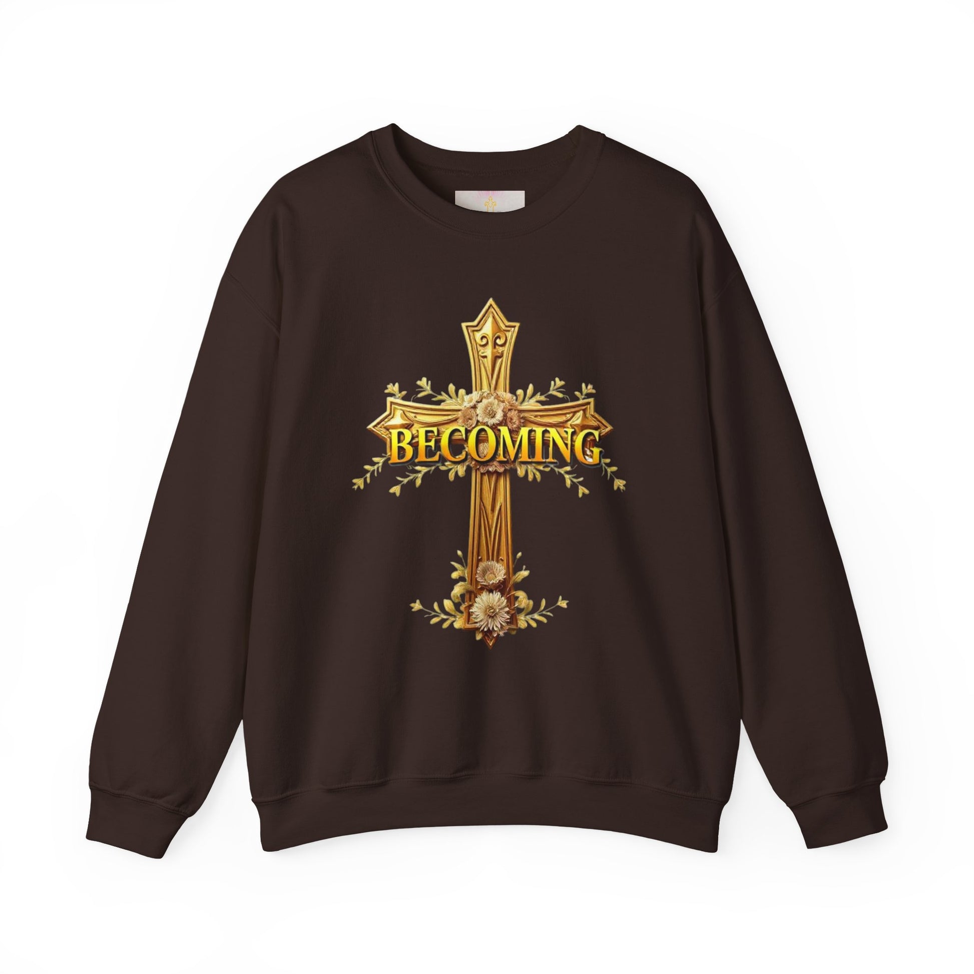 1 Corinthians 15:49 reminds us that we are continually being transformed to reflect the heavenly. This Becoming women’s sweatshirt features the gold cross design on the front with the verse on the back. Styled with light lettering, it pops beautifully against darker fabrics, offering warmth, comfort, and a graceful declaration of faith.