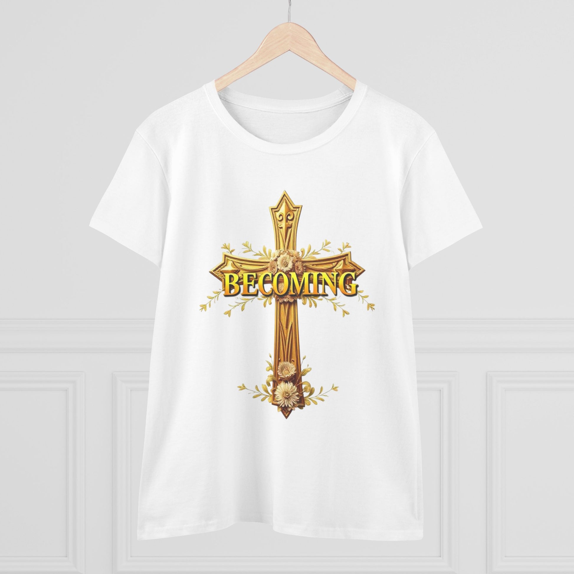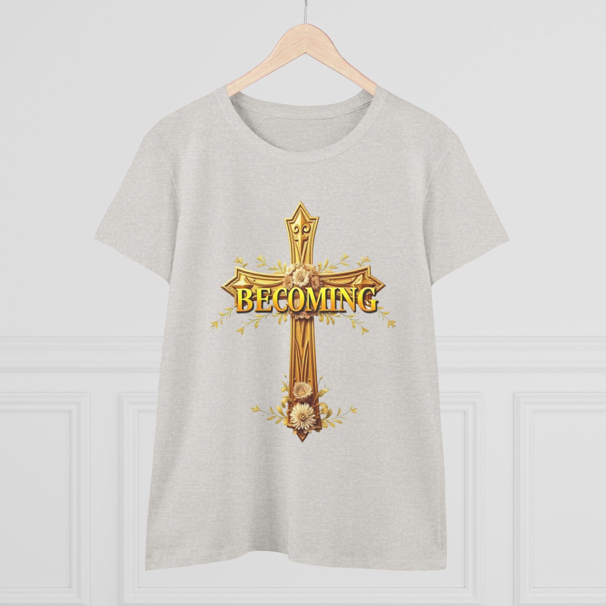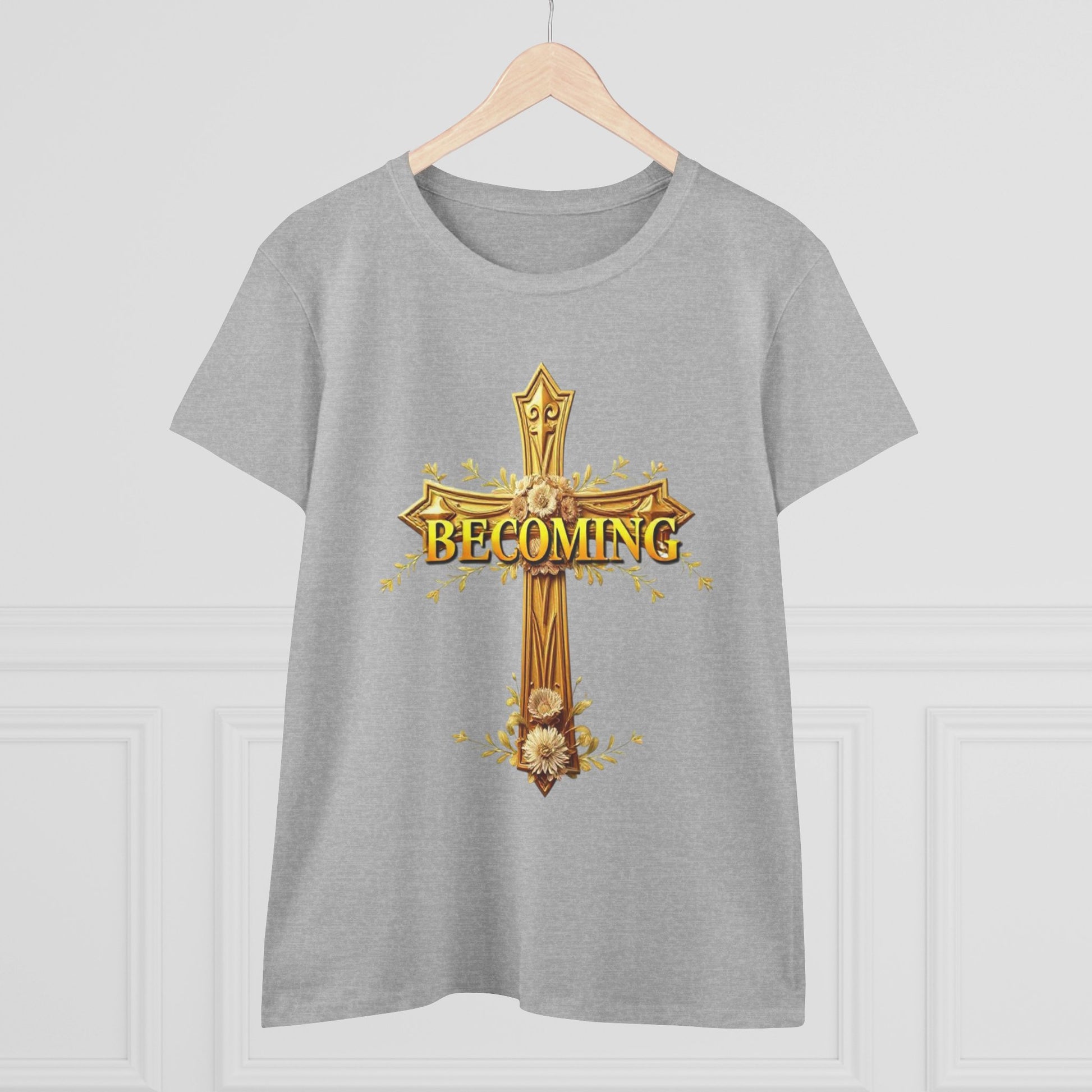 Becoming Women’s Faith Tee – Gold Cross Edition (Dark Lettering, 1 Corinthians 15:49)