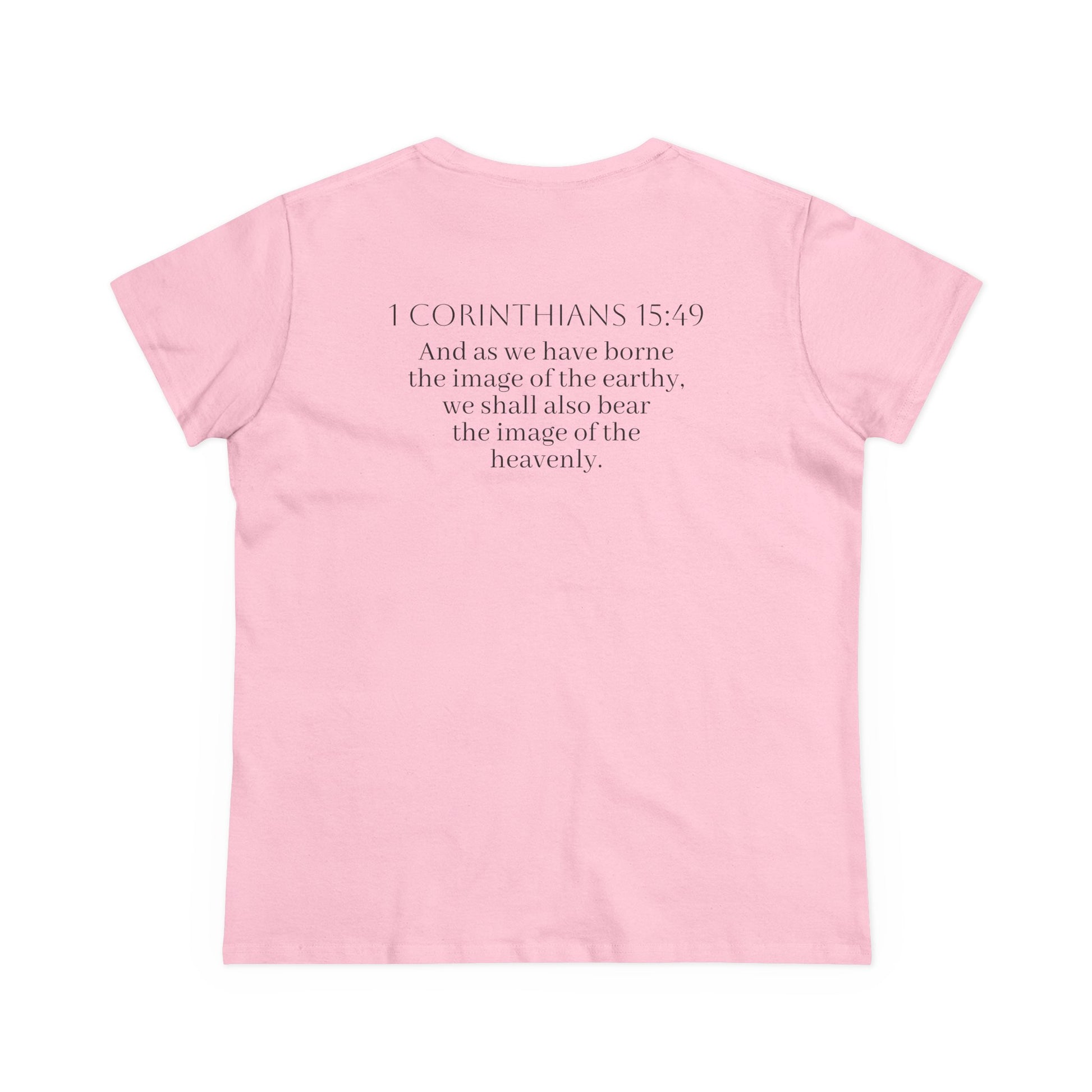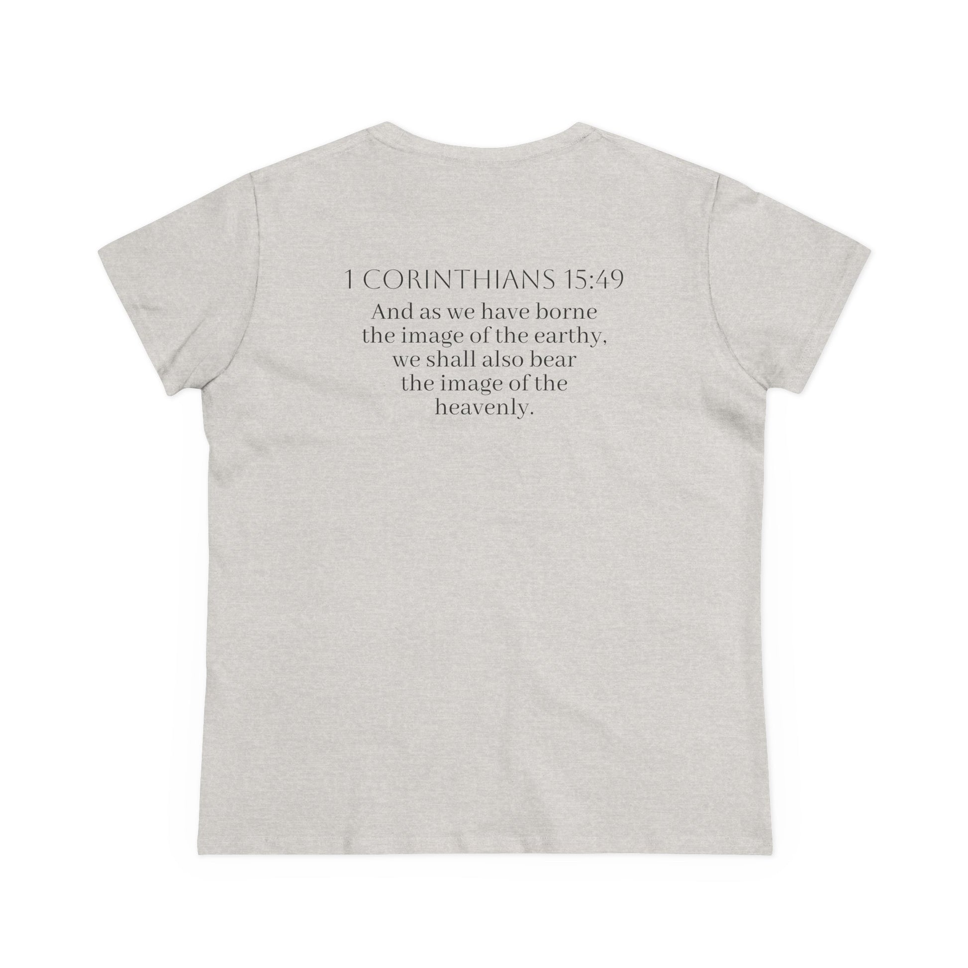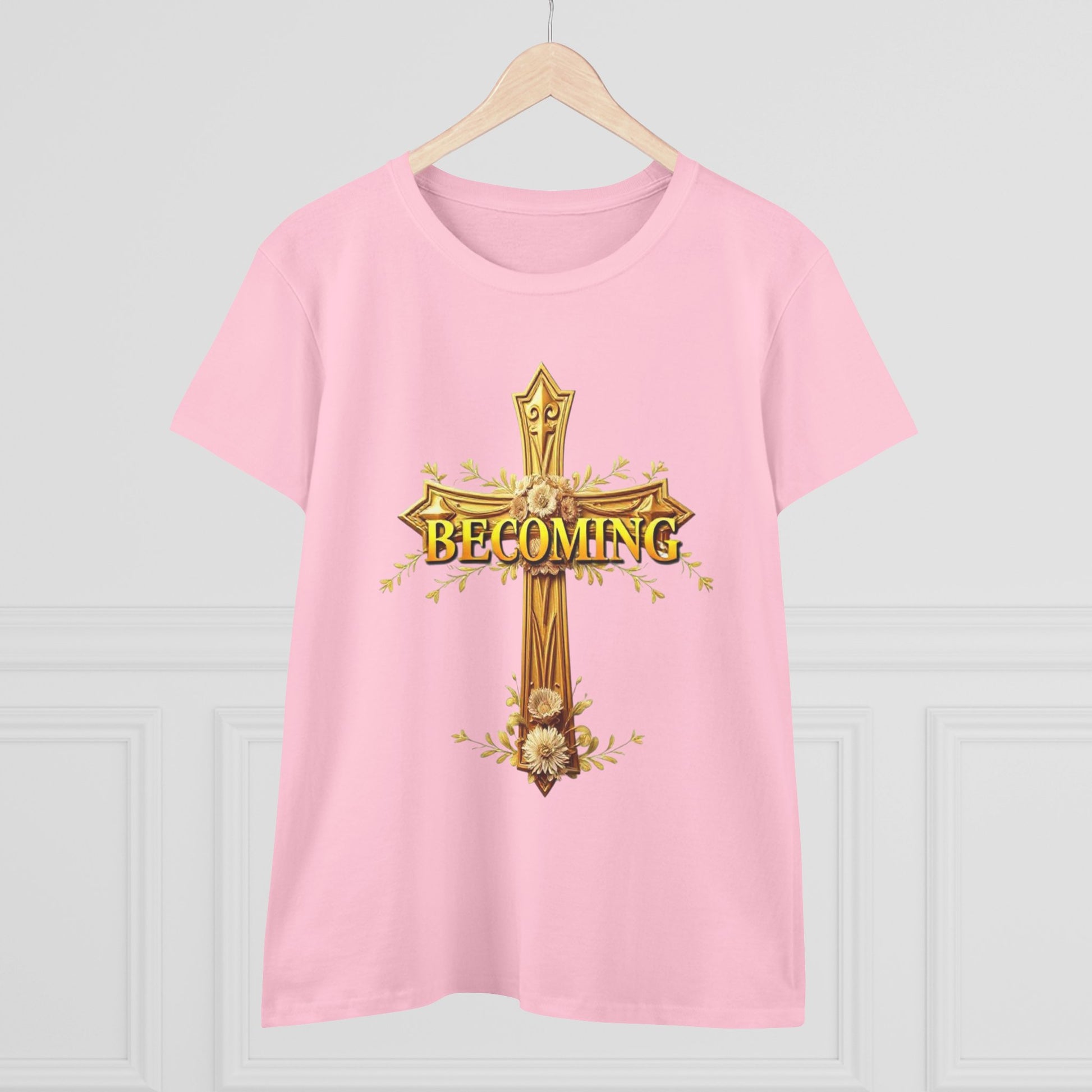 Becoming Women’s Faith Tee – Gold Cross Edition (Dark Lettering, 1 Corinthians 15:49)