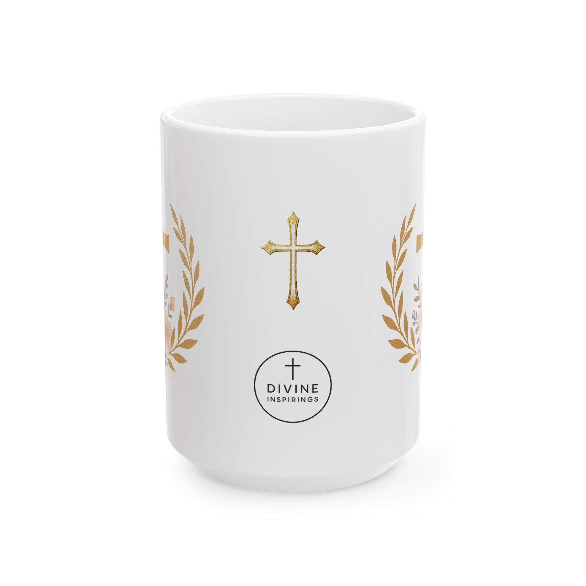 Celebrate the triumph of faith with this stunning coffee mug, featuring a radiant gold cross surrounded by a laurel wreath and delicate floral accents. A symbol of victory, hope, and God’s enduring love, it’s perfect for your morning coffee, tea, or any devotional moment.