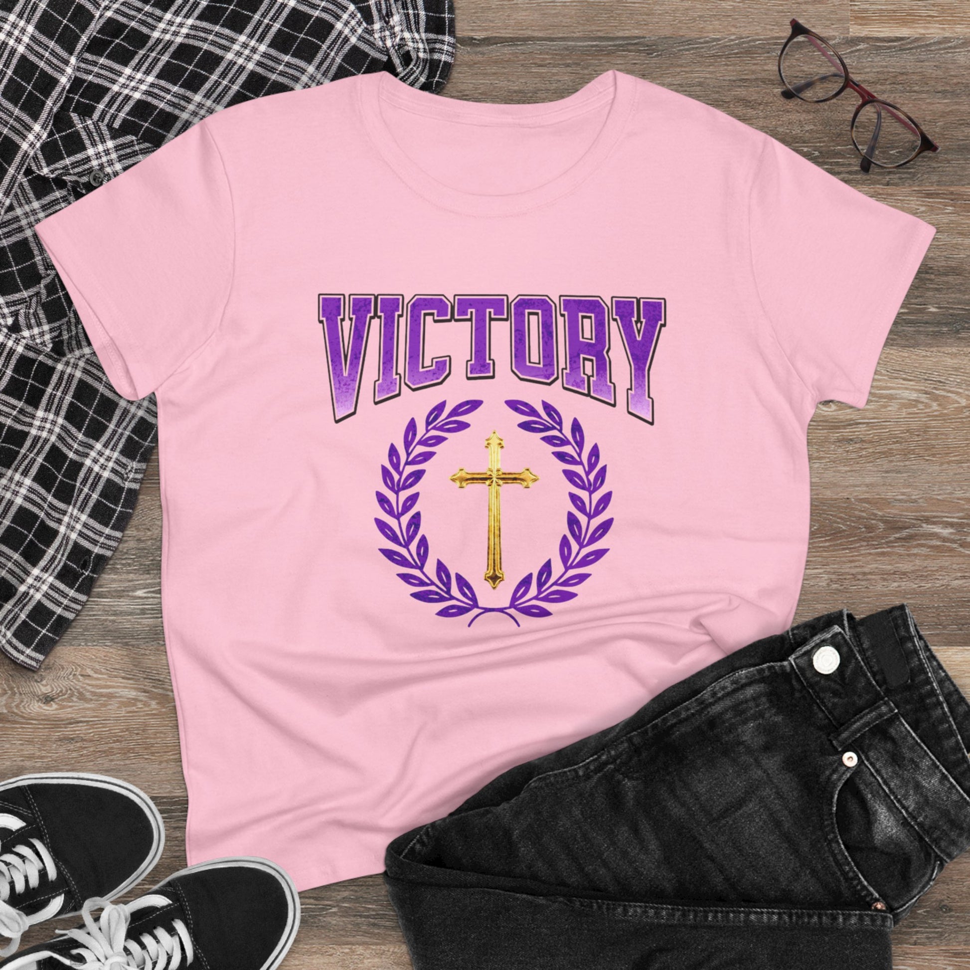 Embrace your faith with confidence in the Victory Women’s Tee. Featuring a striking purple logo, this soft, durable shirt blends comfort and style while inspiring courage and divine strength every day. Perfect for church, casual outings, or making a bold statement of faith.