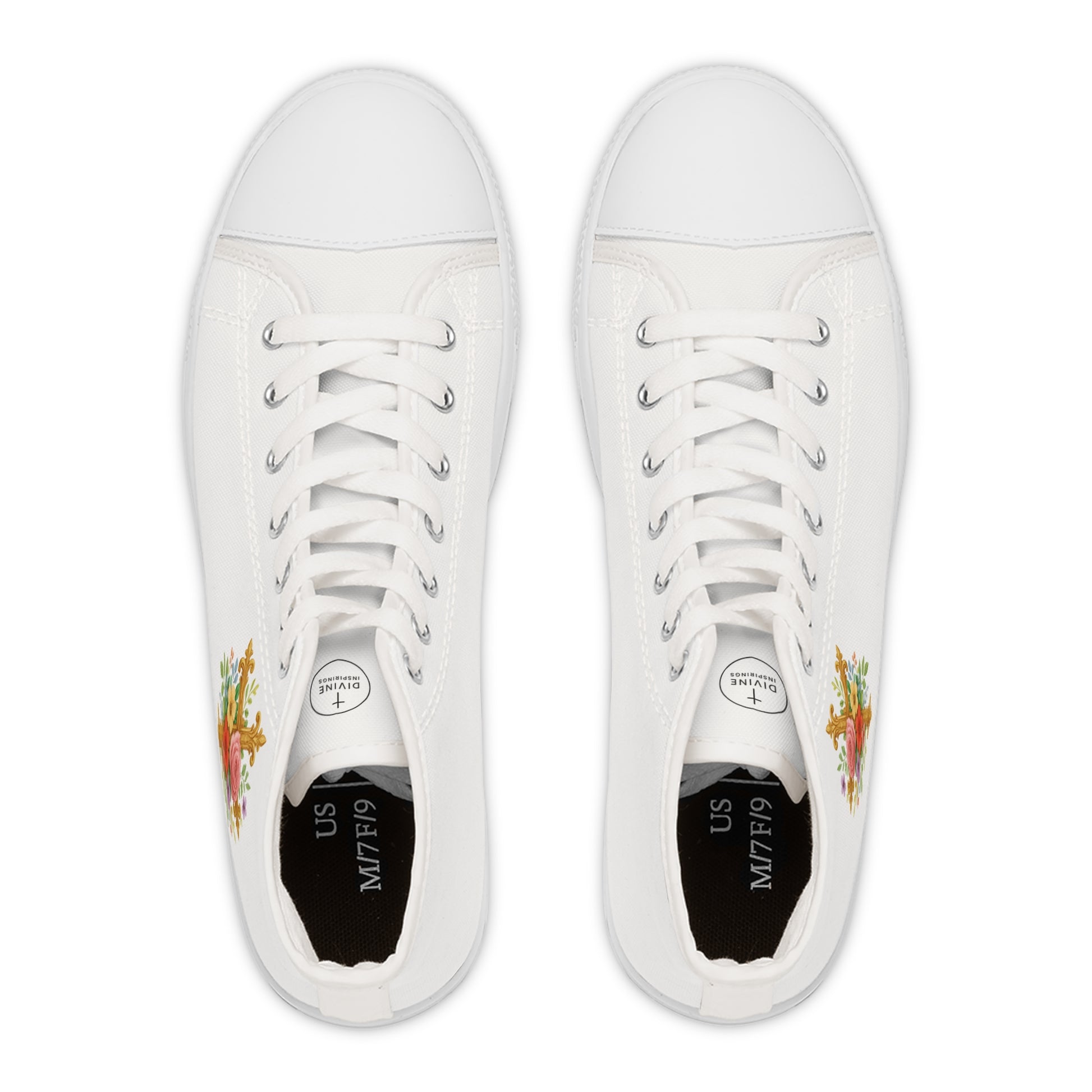 Step into grace and style with the Faith in Bloom High-Tops. Crisp white canvas sneakers feature a delicate floral cross on the outer side and the Divine Inspirings logo on the tongue. Lightweight, comfortable, and durable, these high-tops are perfect for everyday wear, letting you carry your faith with elegance wherever you go.