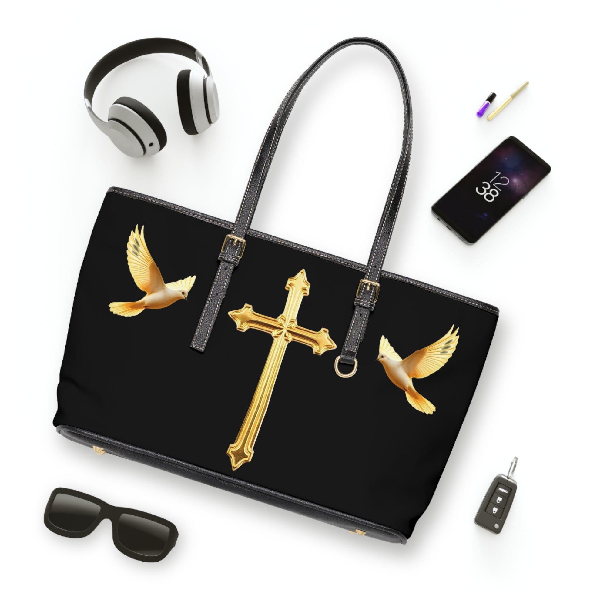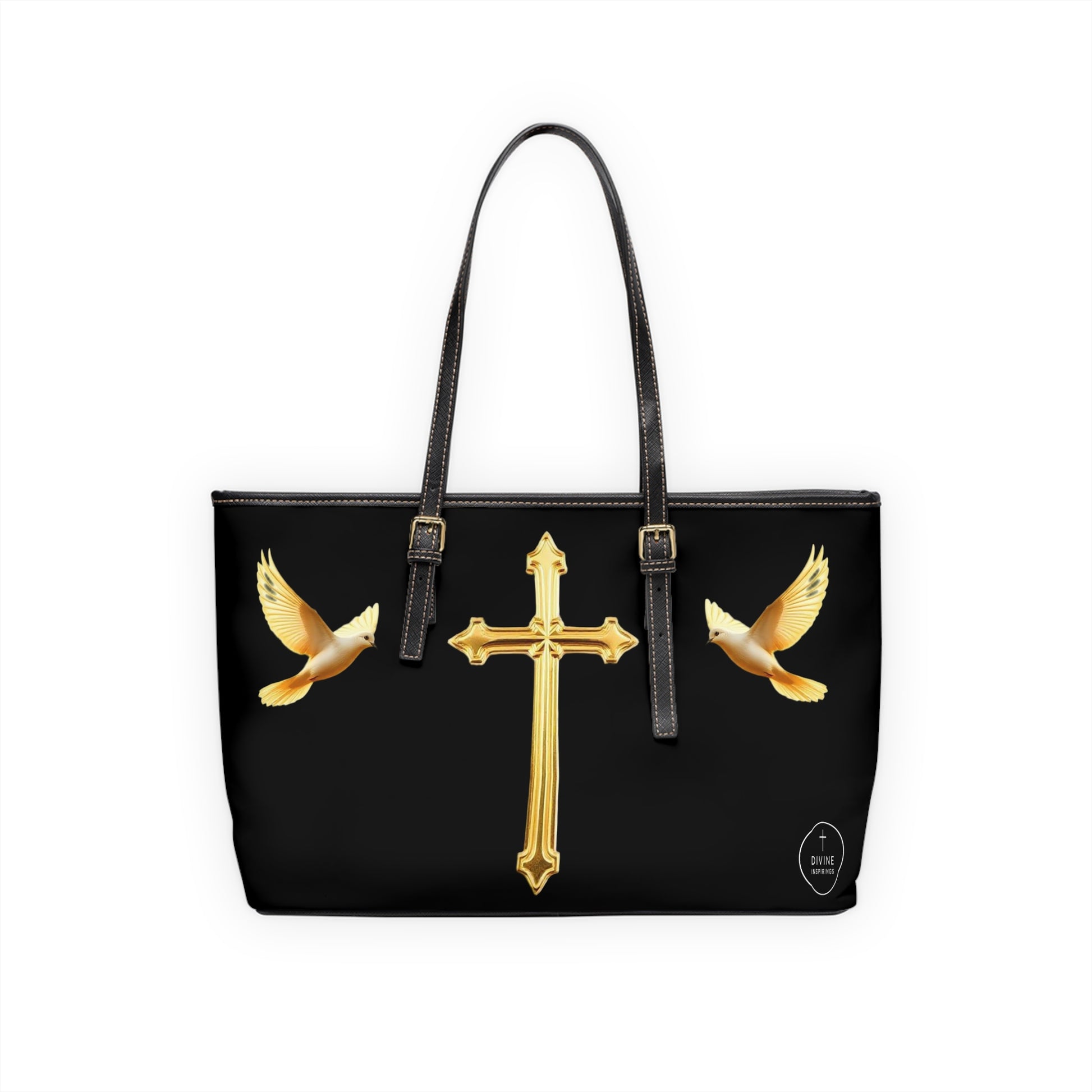 Grace and strength unite in this stunning black PU leather shoulder bag adorned with a golden cross flanked by two soaring doves. The cross shines as a symbol of divine love and redemption, while the doves embody peace, purity, and the Holy Spirit. Crafted for those who walk boldly in faith, this bag is both sophisticated and meaningful — perfect for church, daily wear, or as a heartfelt gift of inspiration. Its durable PU leather and elegant finish make it as enduring as the faith it represents. Carry peace. Carry purpose. Carry Christ.