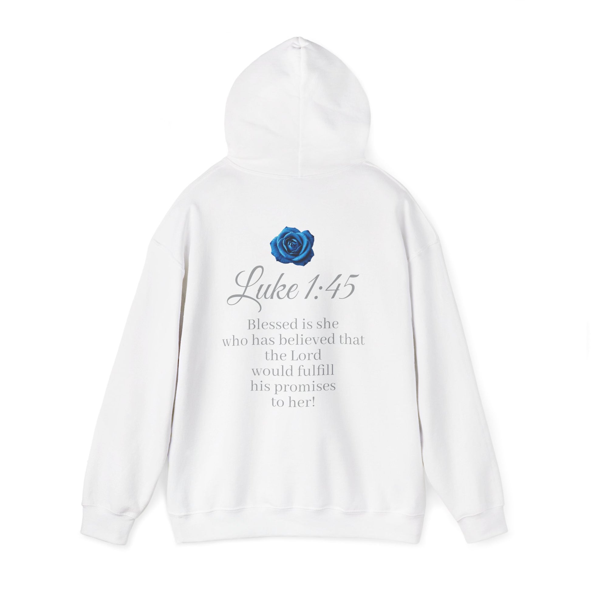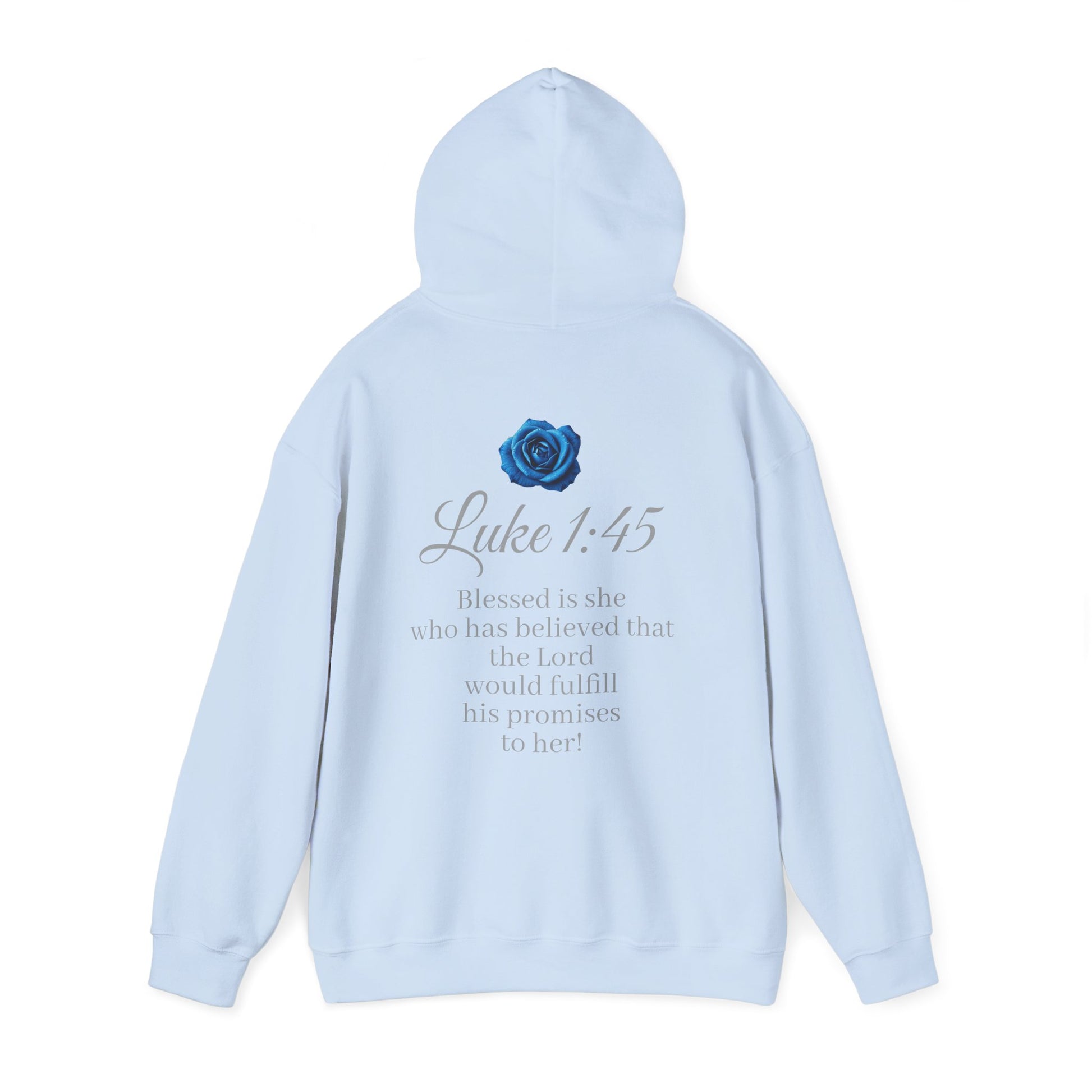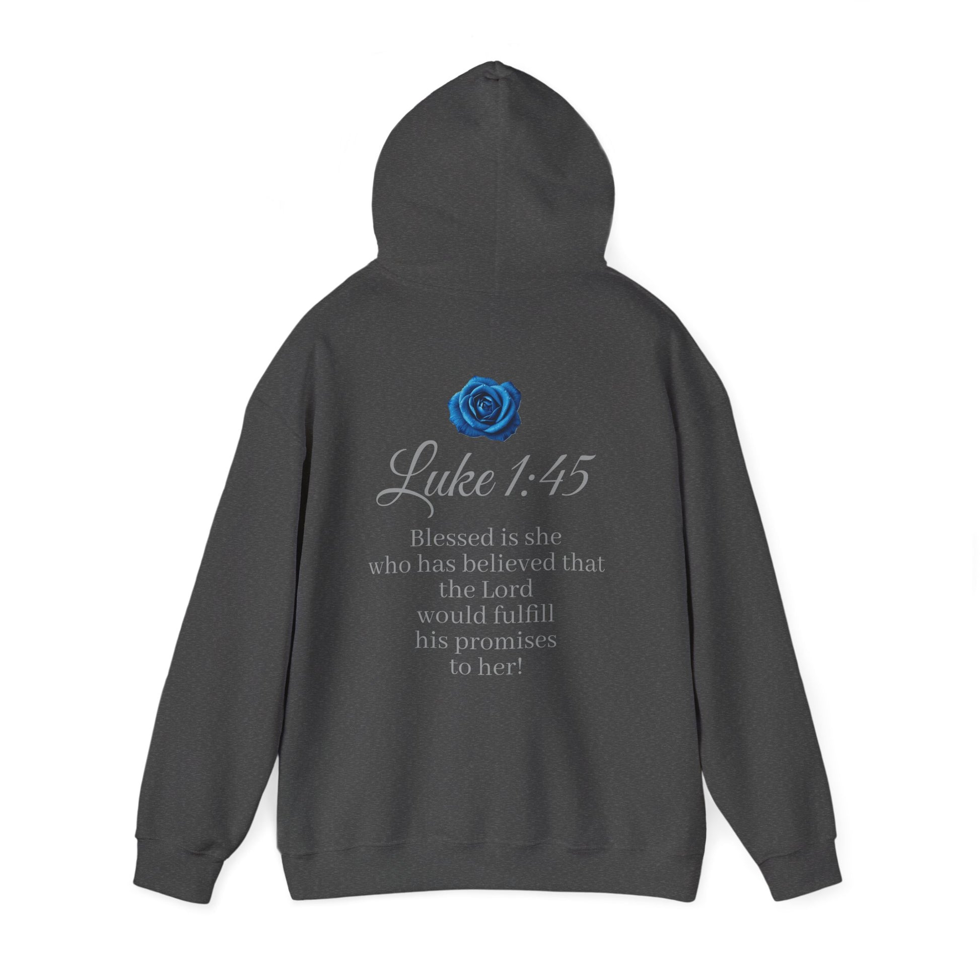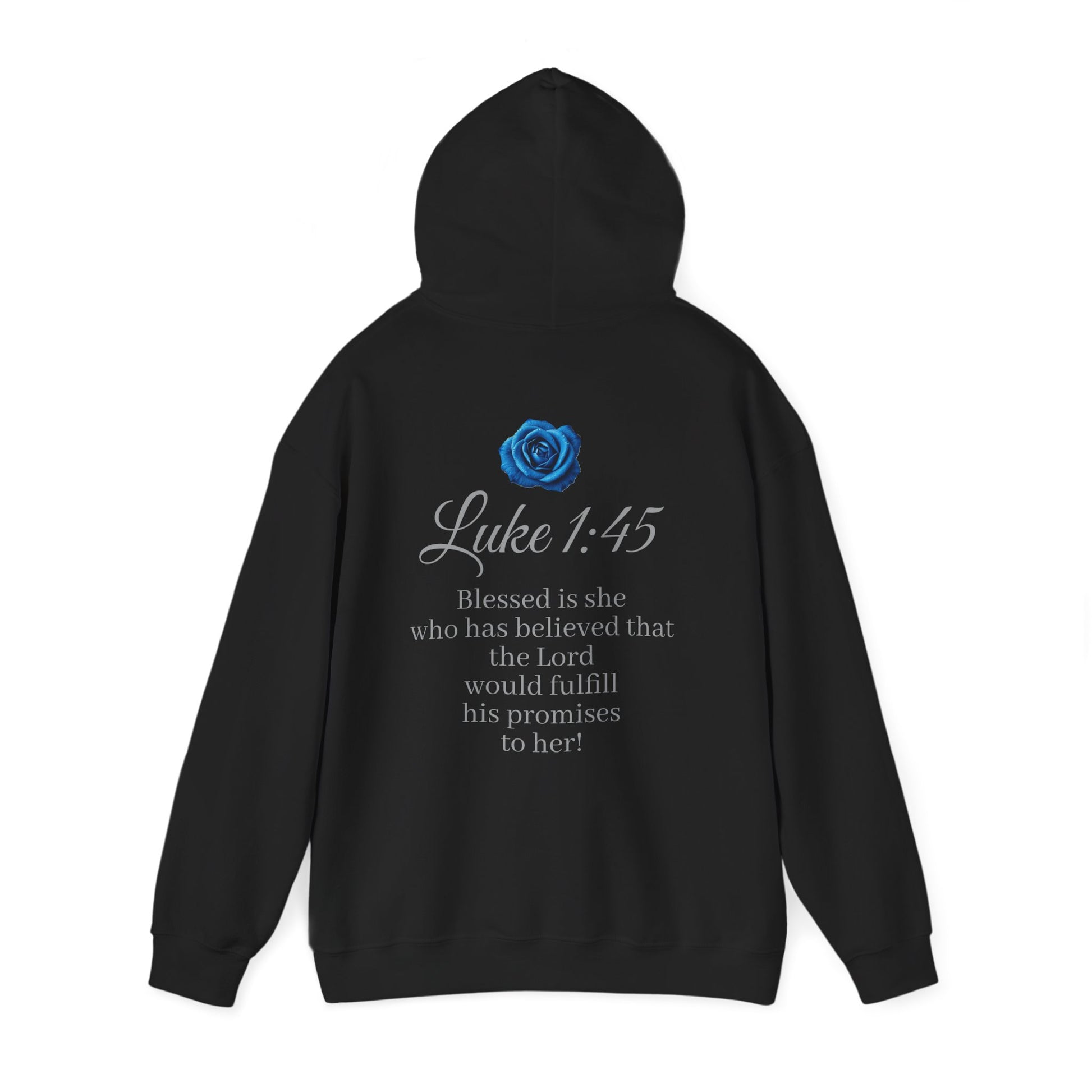 Faith meets comfort with timeless beauty. This women’s hoodie displays “FAITH” across the front and the uplifting words of Luke 1:45 on the back: “Blessed is she who has believed that the Lord would fulfill his promises to her!” Perfect for women who walk with confidence in God’s promises, this hoodie is both cozy and meaningful—an everyday reminder of hope, trust, and inner strength.