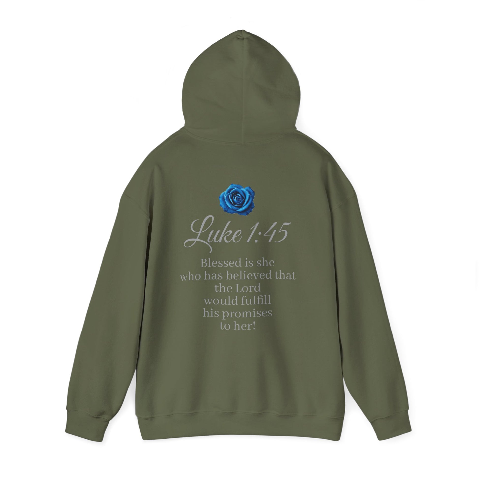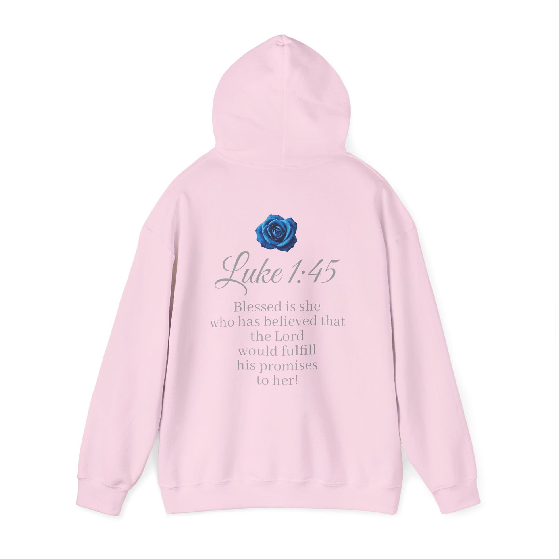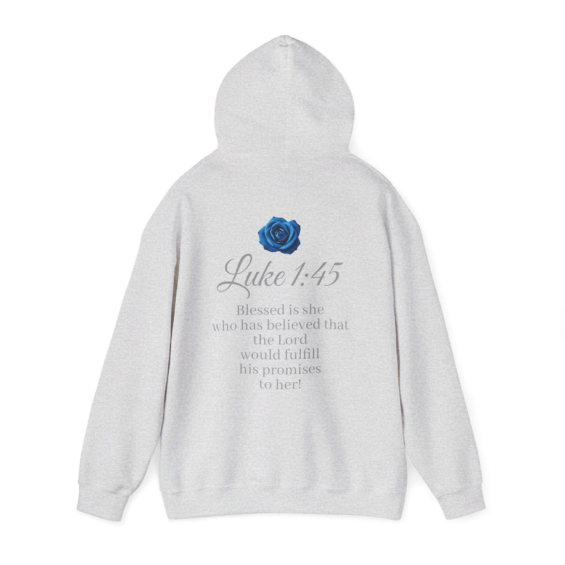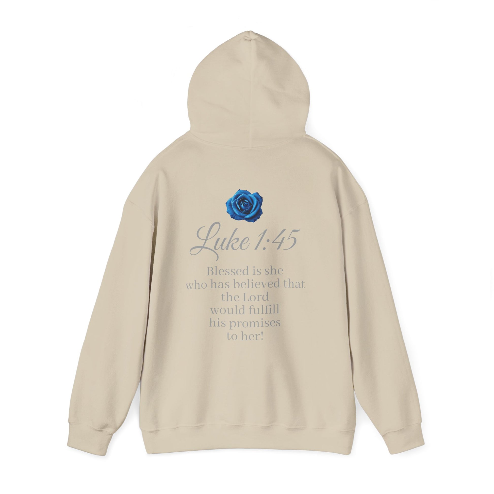 Faith meets comfort with timeless beauty. This women’s hoodie displays “FAITH” across the front and the uplifting words of Luke 1:45 on the back: “Blessed is she who has believed that the Lord would fulfill his promises to her!” Perfect for women who walk with confidence in God’s promises, this hoodie is both cozy and meaningful—an everyday reminder of hope, trust, and inner strength.