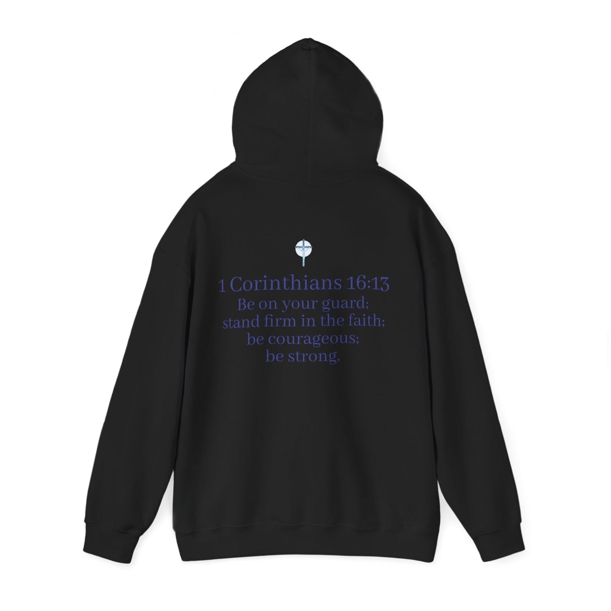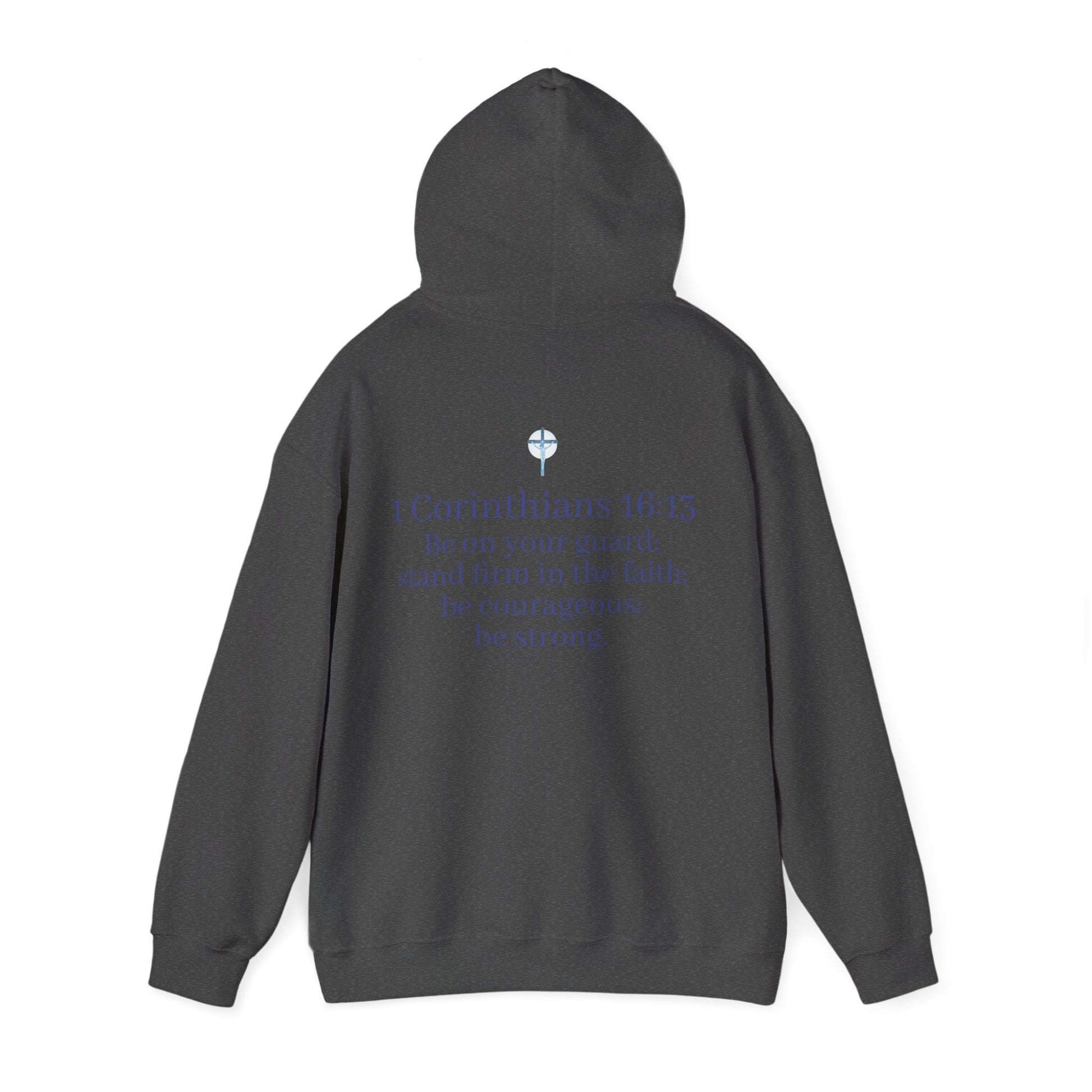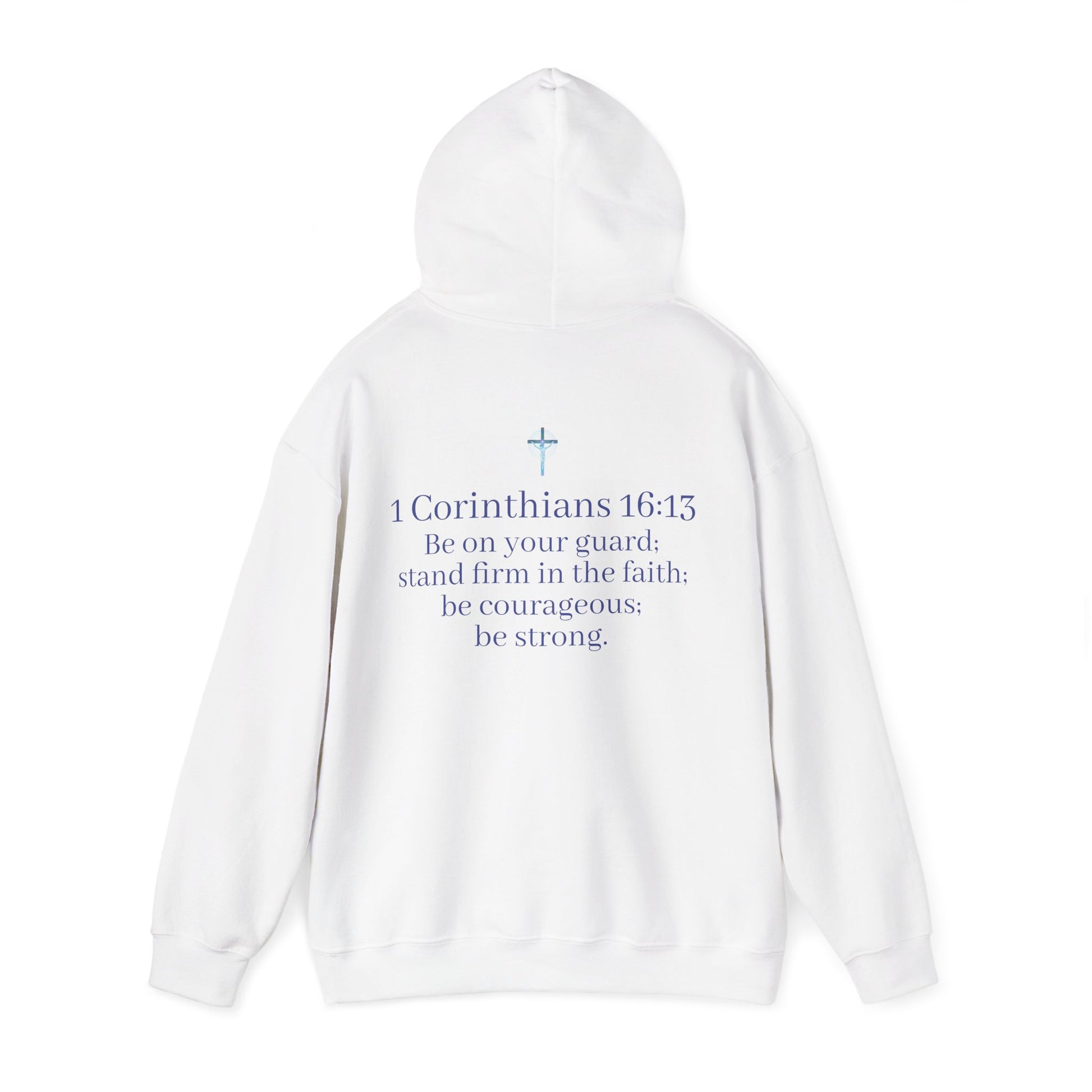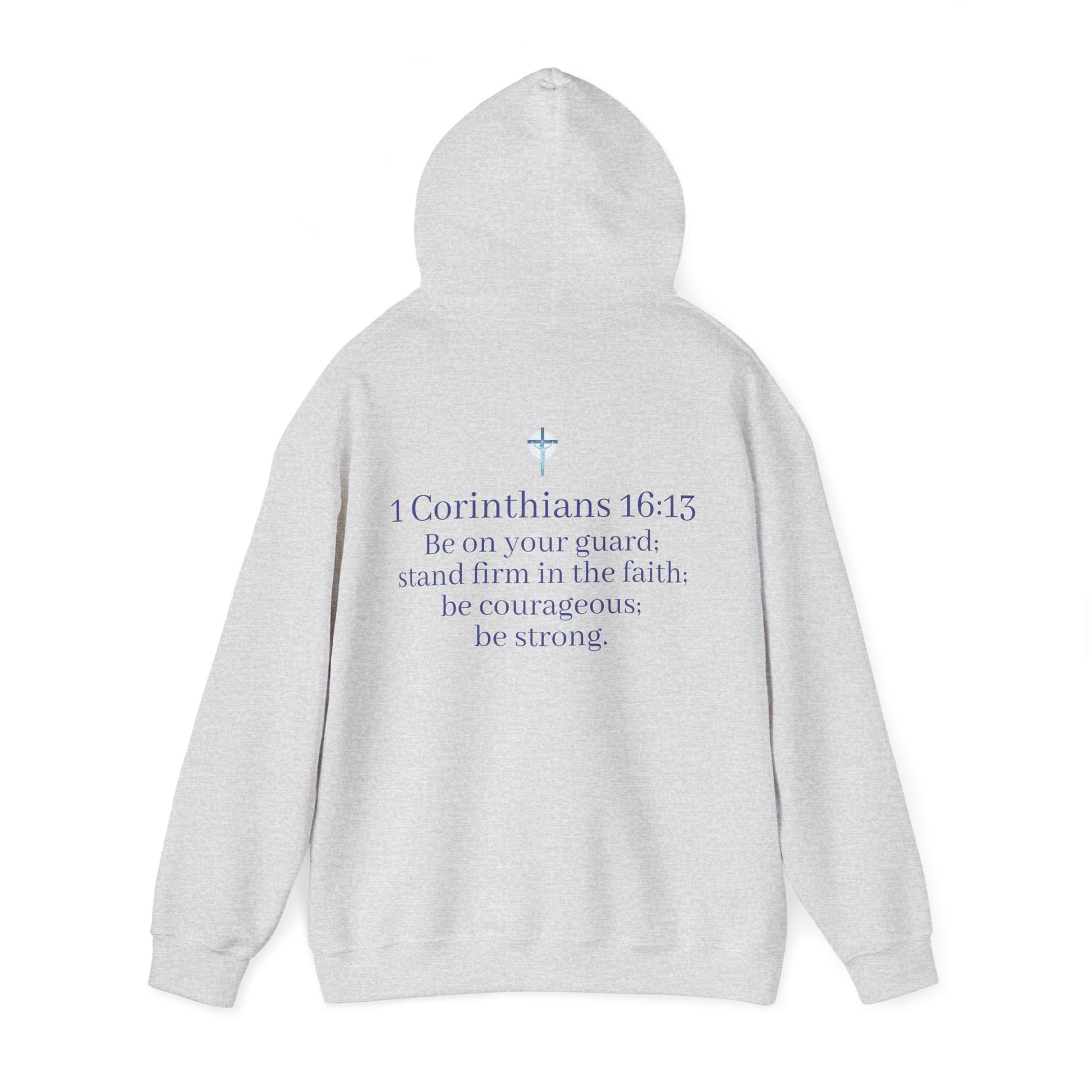 Bold faith, built for everyday strength. This men’s hoodie displays “FAITH” across the front and the powerful words of 1 Corinthians 16:13 on the back: “Be on your guard; stand firm in the faith; be courageous; be strong.” A statement of courage and conviction, this hoodie is perfect for men who live with purpose and walk confidently in their faith. Durable, comfortable, and inspiring—a true expression of strength in Christ.