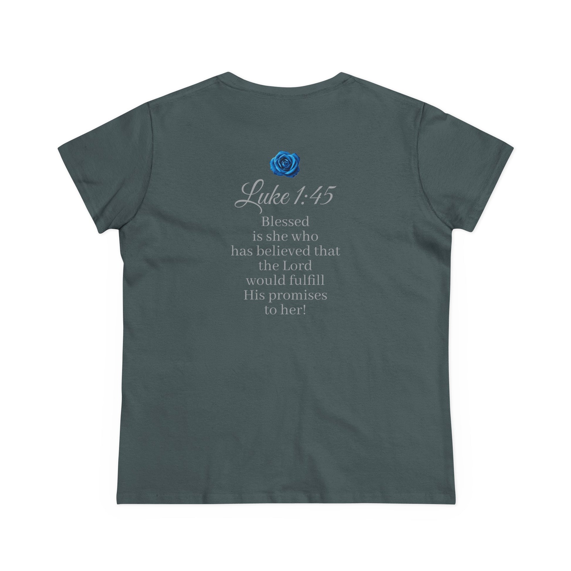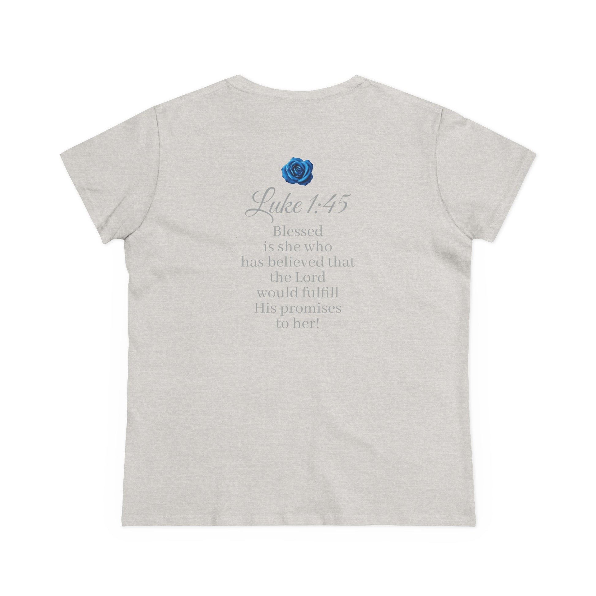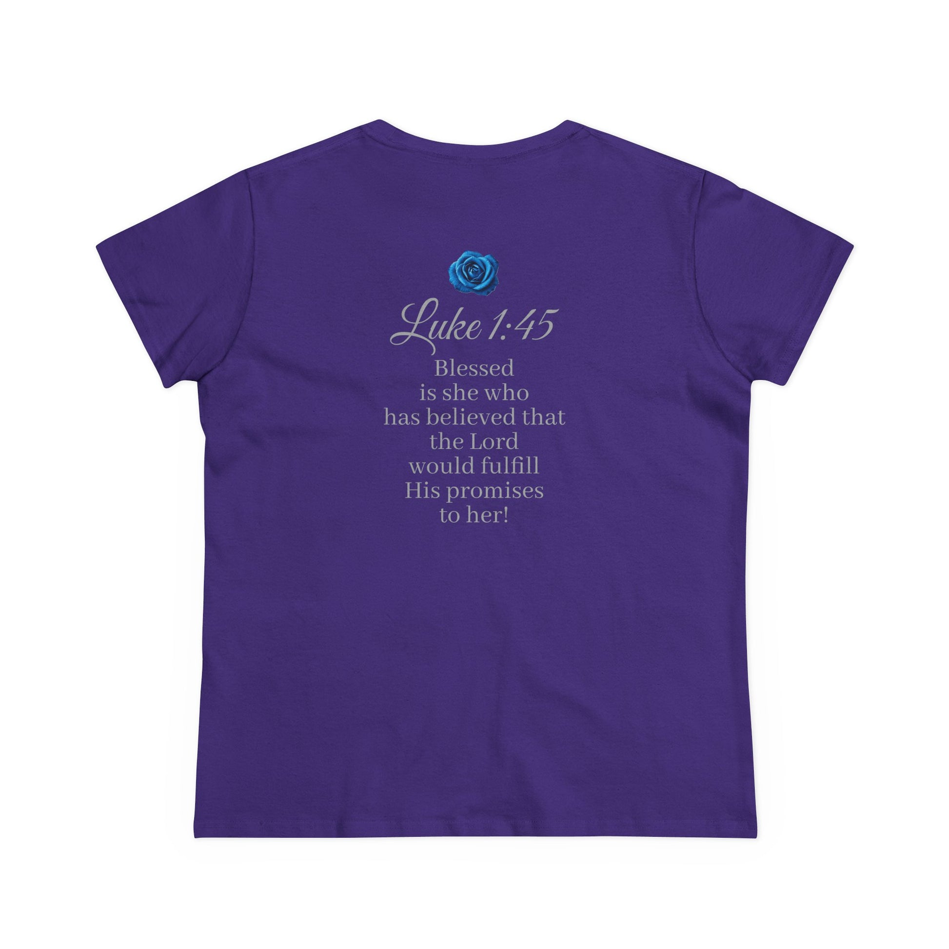 Bold, beautiful, and full of hope. This women's tee features the word “FAITH” on the front, paired with the empowering Scripture Luke 1:45: "Blessed is she who has believed that the Lord would fulfill his promises to her!" Perfect for women who carry trust in their hearts, embrace God’s promises, and walk confidently in their faith. Wear it as a daily reminder of God’s faithfulness and your inner strength.