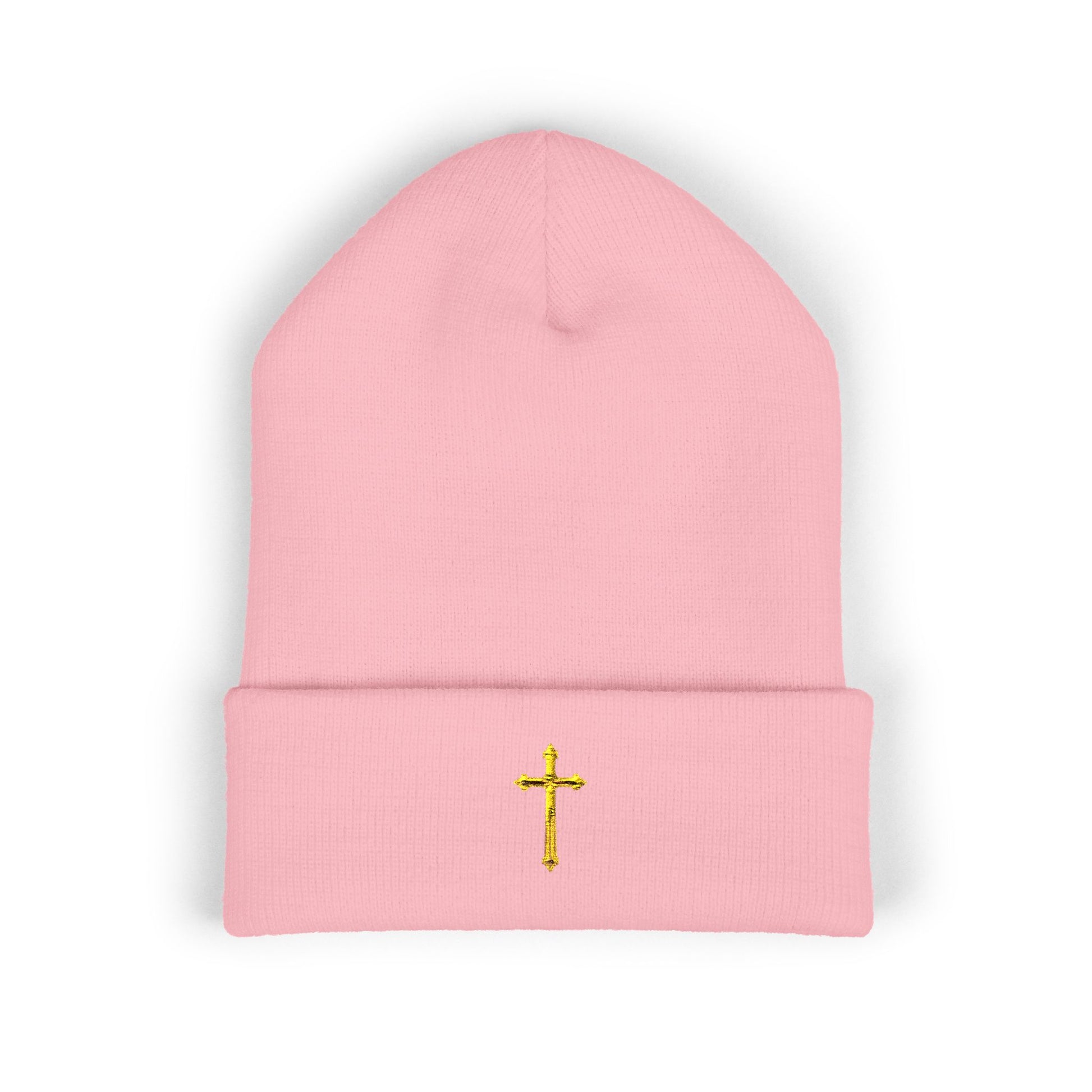 Golden Grace Cuffed Beanie – Embroidered Cross