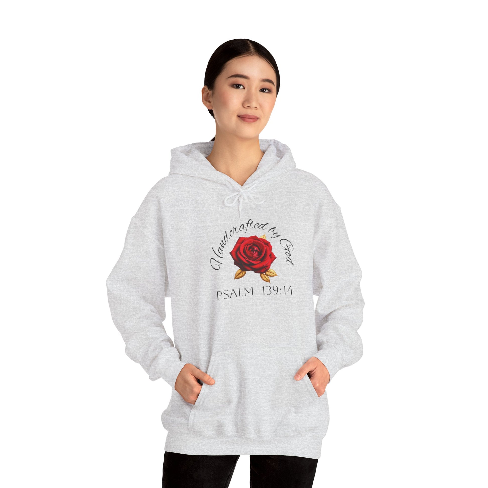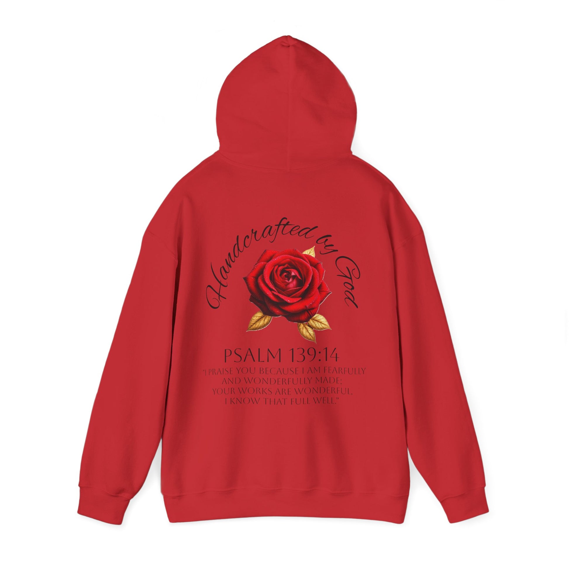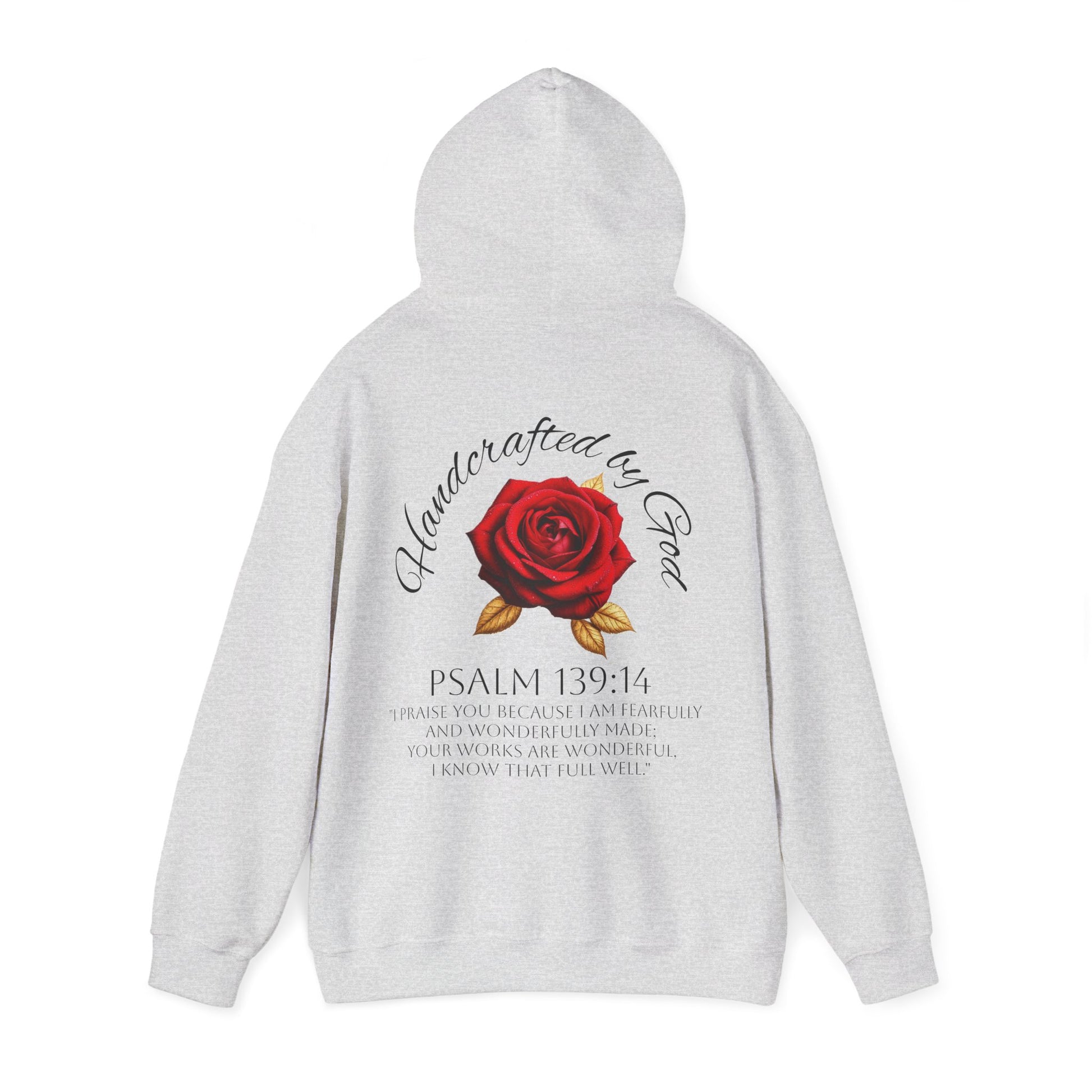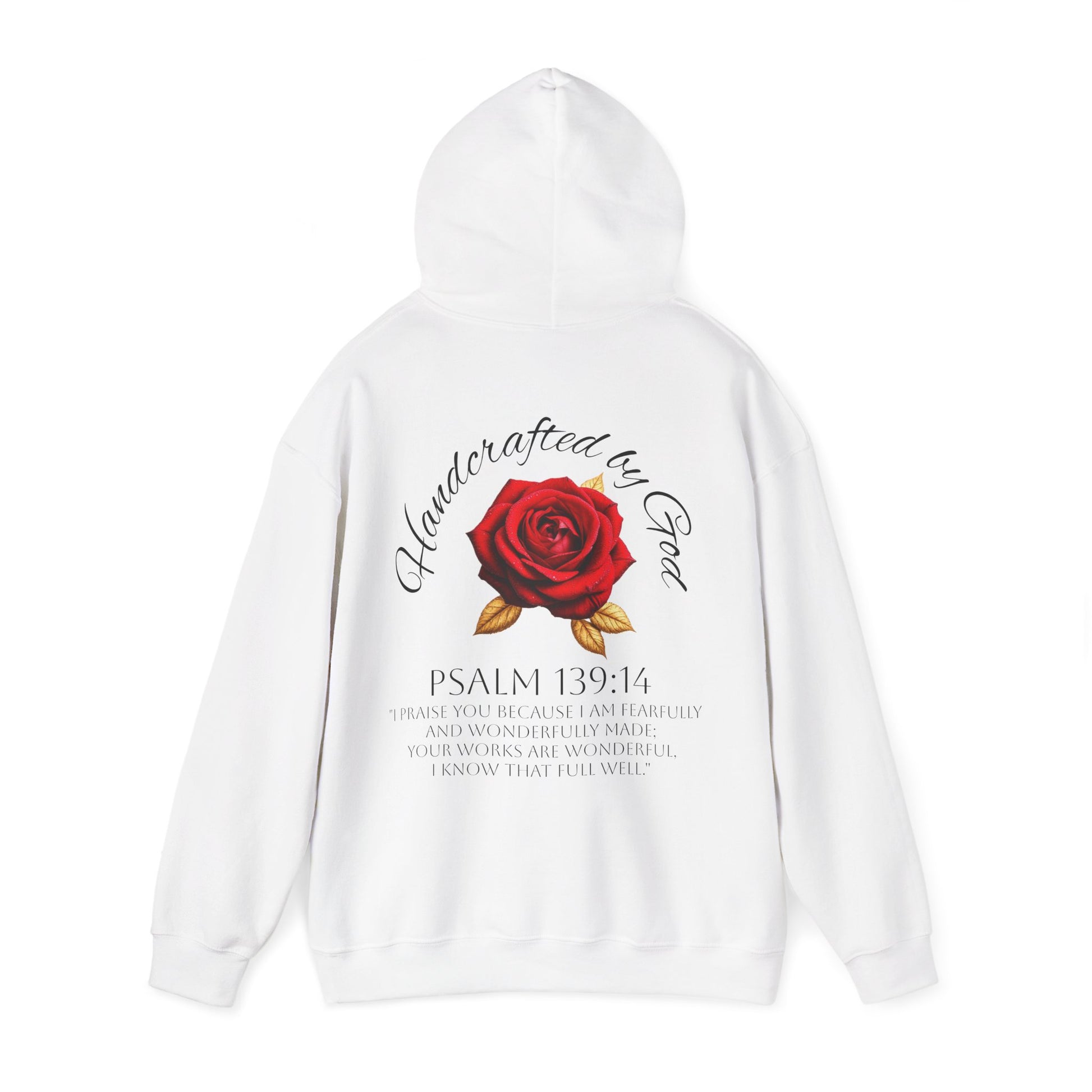 Wrap yourself in comfort and faith with this cozy hoodie featuring a beautifully detailed rose and the inspiring words “Handcrafted by God” in dark lettering. Psalm 139:14 serves as a daily reminder of God’s incredible craftsmanship in your life. Perfect for casual outings, prayer gatherings, or gifting to someone who needs a boost of encouragement.