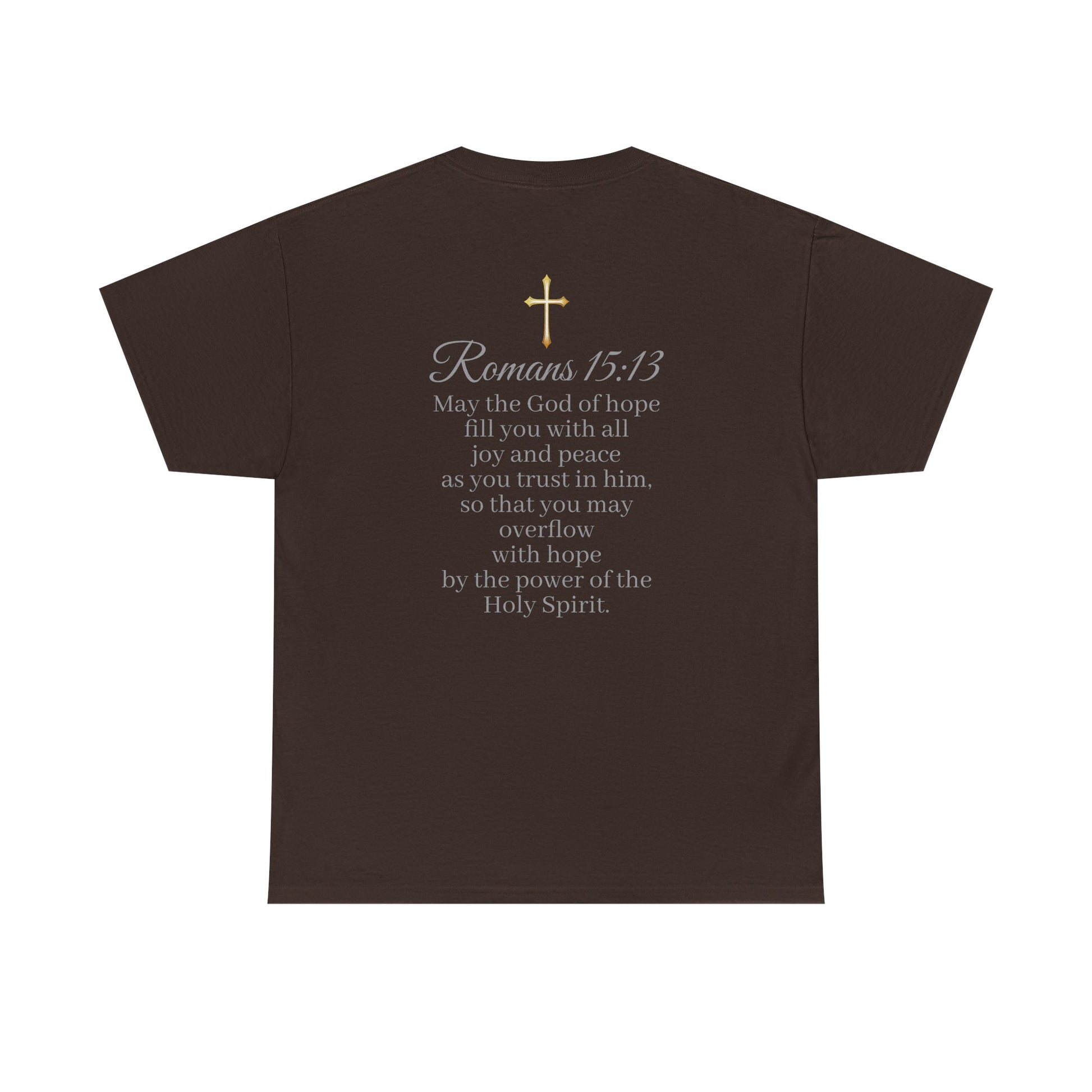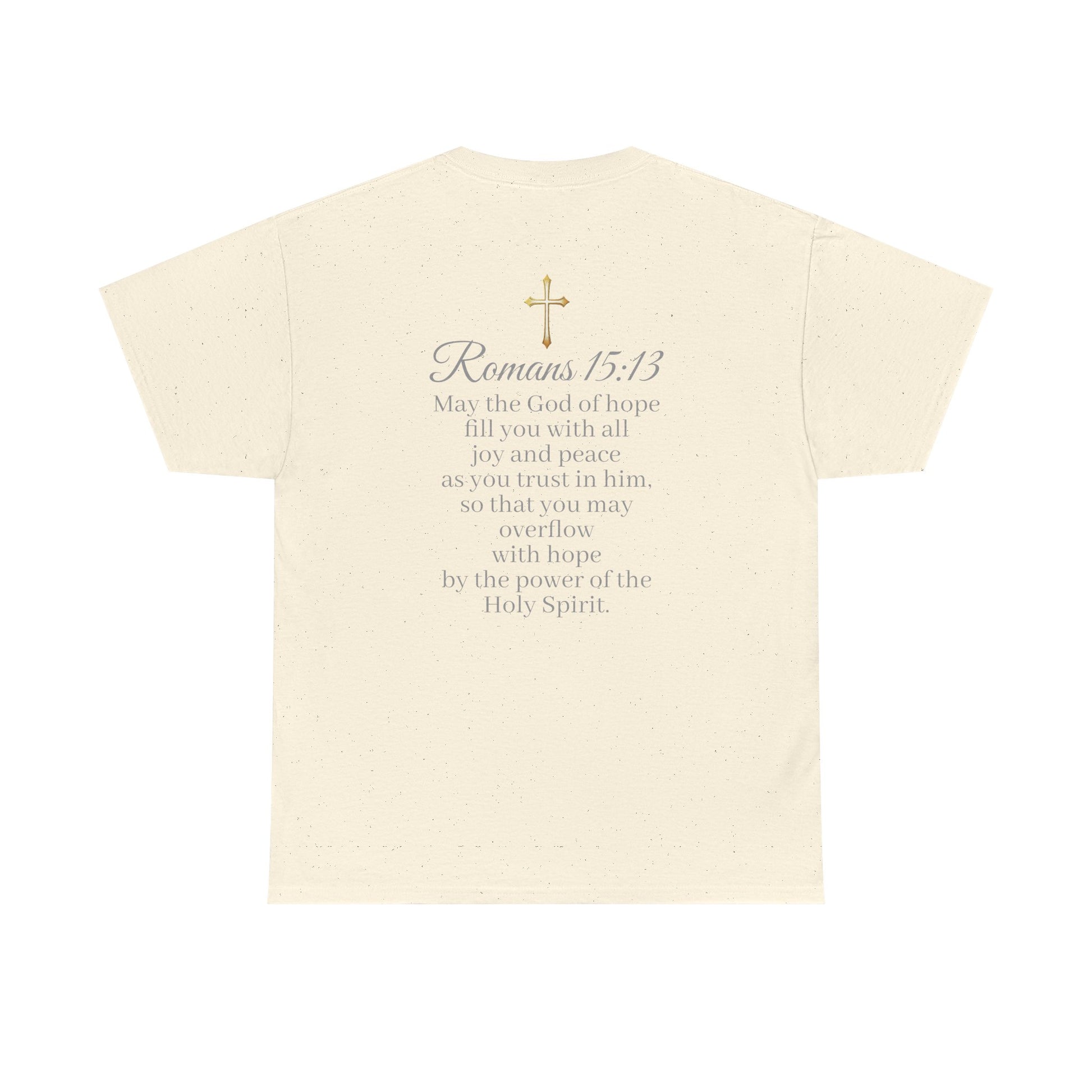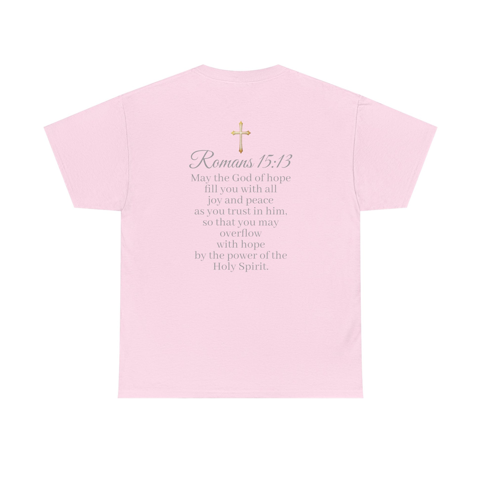 Embrace hope and joy with this feminine “Hope” tee, designed to inspire and uplift. Featuring HOPE elegantly on the front and the full verse Romans 15:13 on the back. This shirt isn’t just fashion—it’s a daily reminder to walk in God’s peace, trust His timing, and let your faith shine. Perfect for casual days, church, or as a thoughtful gift for the women who inspire you.