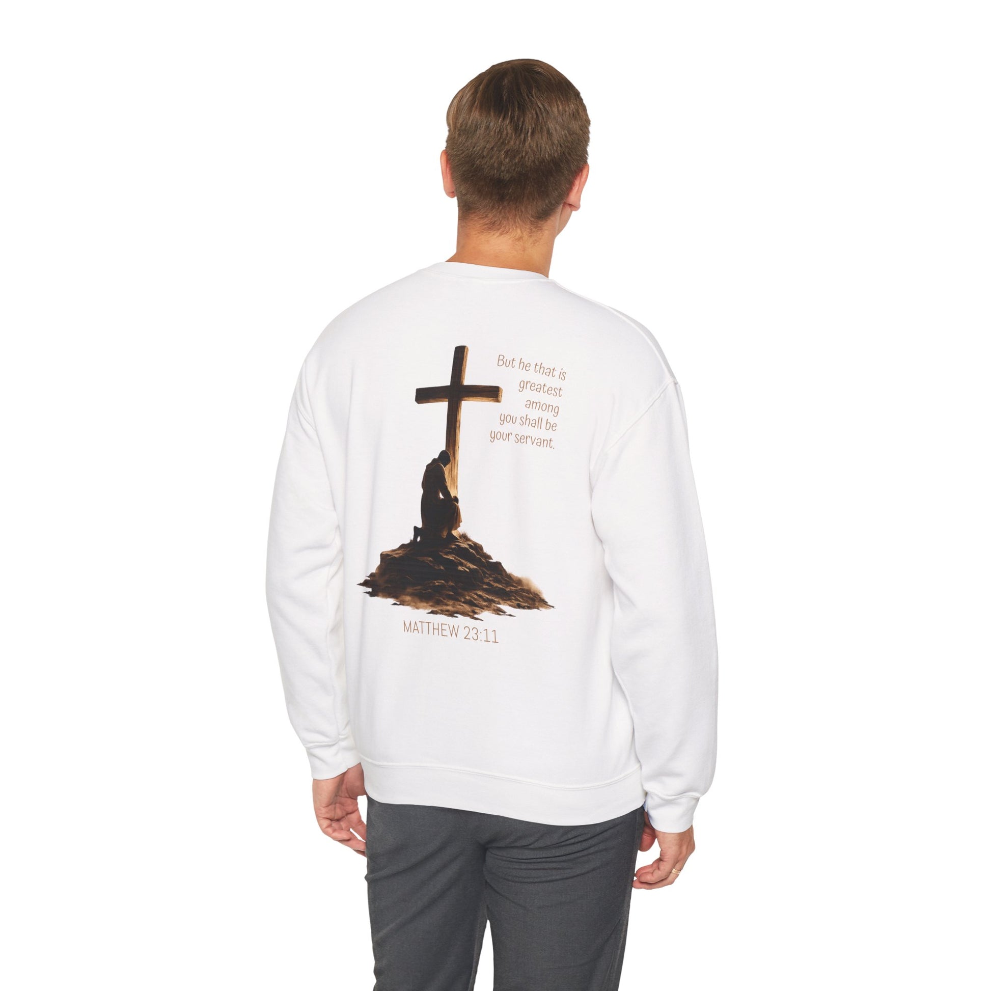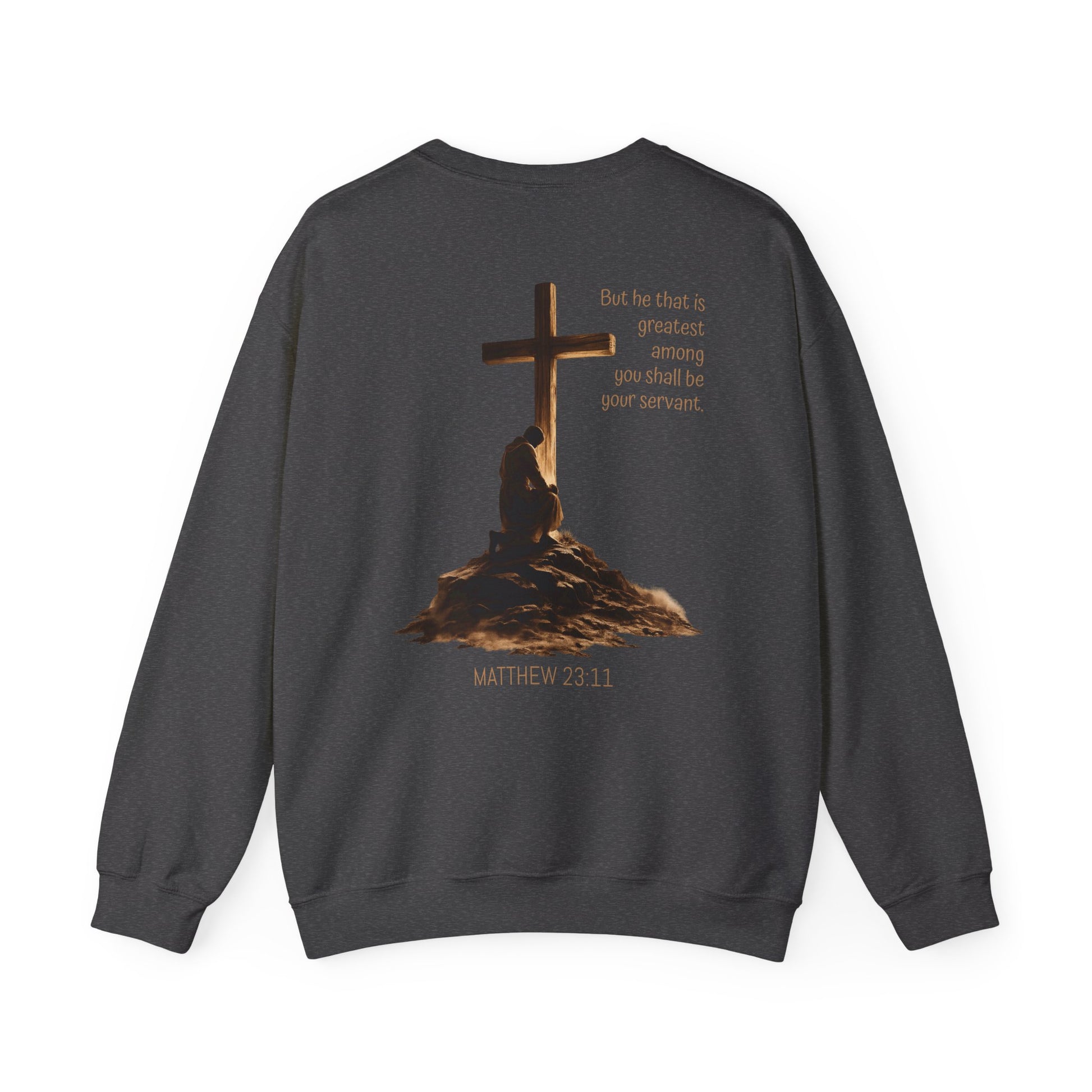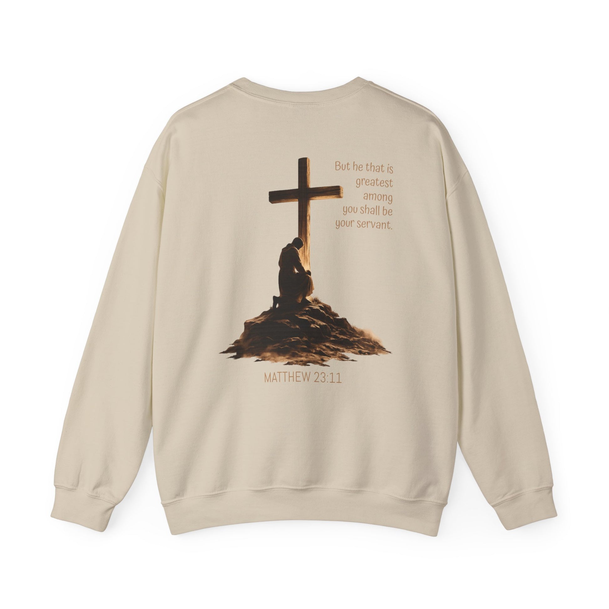Soft, simple, and quietly powerful — this crewneck wraps a familiar silhouette around a moment of faith. Clean white fleece provides a calm canvas for a small hill-and-cross on the front and a larger, painterly cross-and-kneeling-figure print on the back. The back also includes a gentle, handwritten-style scripture reference Matthew 23:11- a whispered reminder of humility and service. Wear it layered for reflective mornings, to church gatherings, or on days when you want your walk of faith to feel visible but unassuming. The classic fit and midweight fabric make it comfortable for weekend rest, traveling between home and ministry, or quiet evenings of prayer.