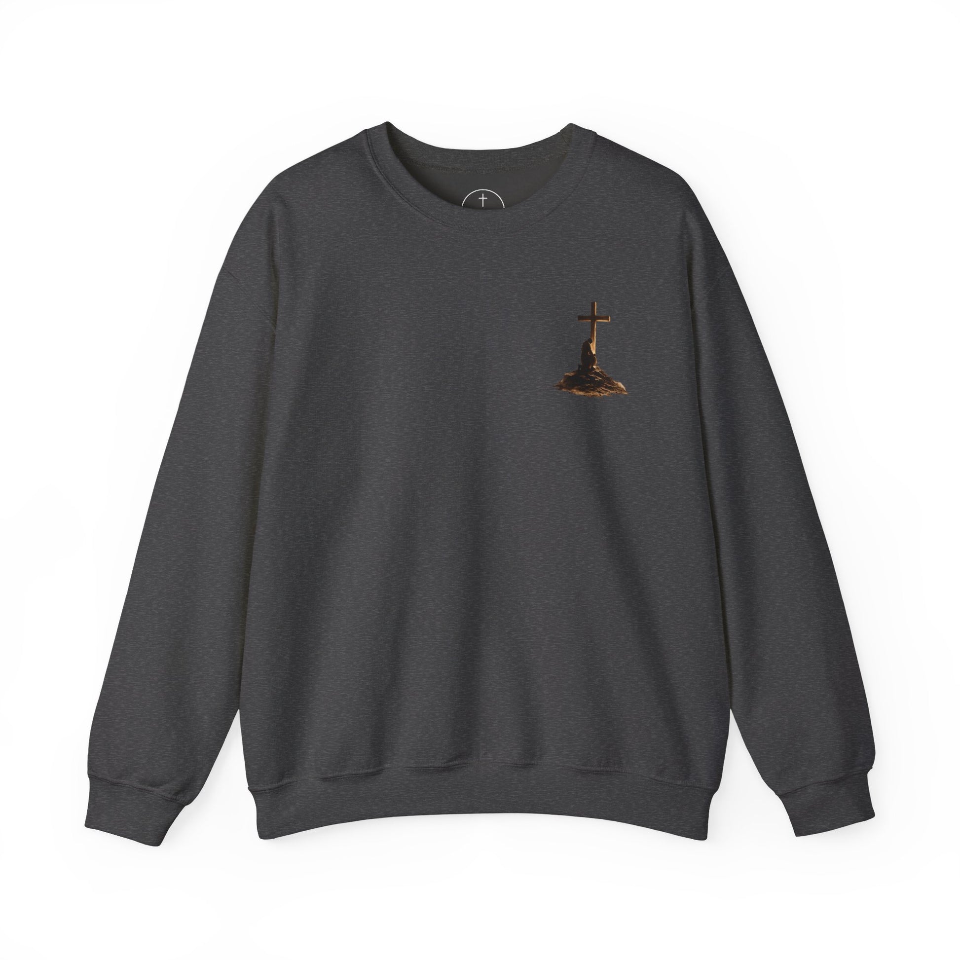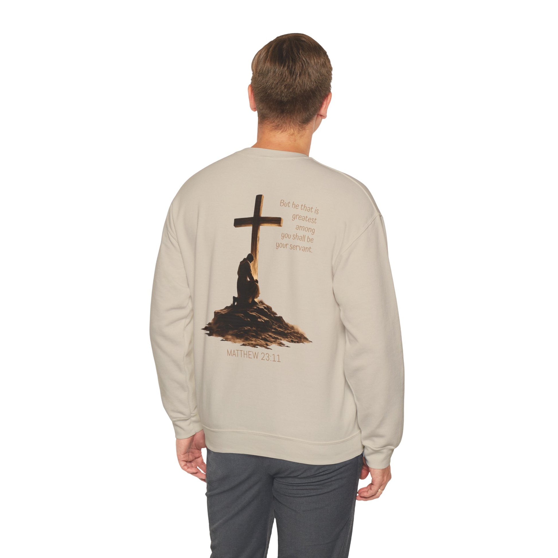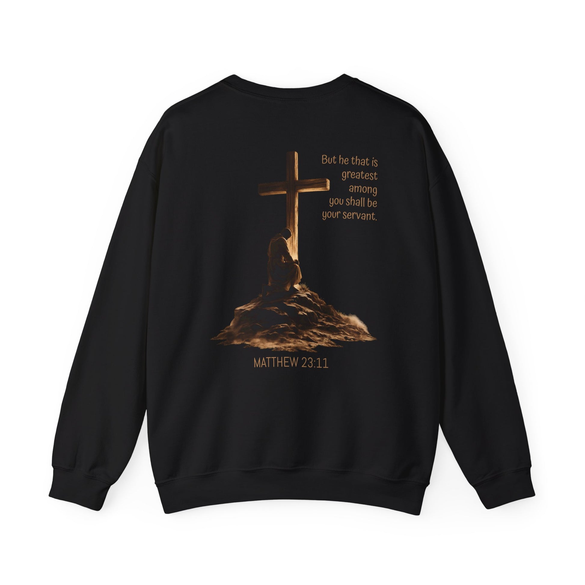 Soft, simple, and quietly powerful — this crewneck wraps a familiar silhouette around a moment of faith. Clean white fleece provides a calm canvas for a small hill-and-cross on the front and a larger, painterly cross-and-kneeling-figure print on the back. The back also includes a gentle, handwritten-style scripture reference Matthew 23:11- a whispered reminder of humility and service. Wear it layered for reflective mornings, to church gatherings, or on days when you want your walk of faith to feel visible but unassuming. The classic fit and midweight fabric make it comfortable for weekend rest, traveling between home and ministry, or quiet evenings of prayer.