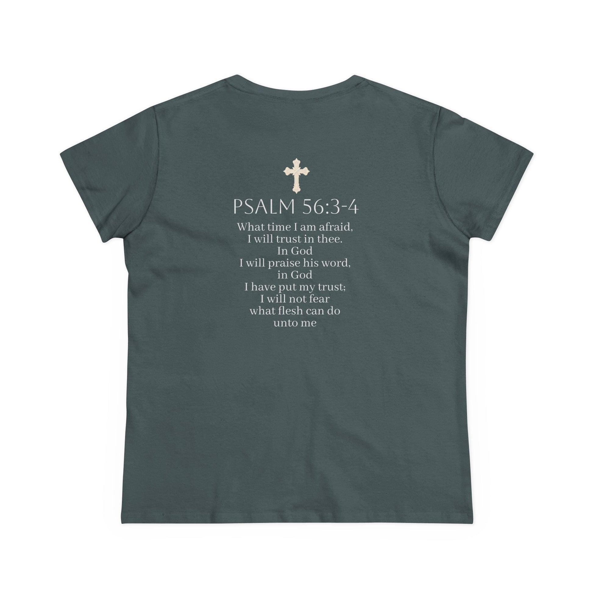 Show your faith front and center with this women’s Christian tee, featuring a silver “In God We Trust” design with a cross backdrop on the front. The back displays the inspiring words of Psalm 56:3–4 (KJV) as a bold reminder to trust God in all circumstances. Comfortable, stylish, and perfect for everyday wear, this tee blends faith, fashion, and devotion in one statement piece.