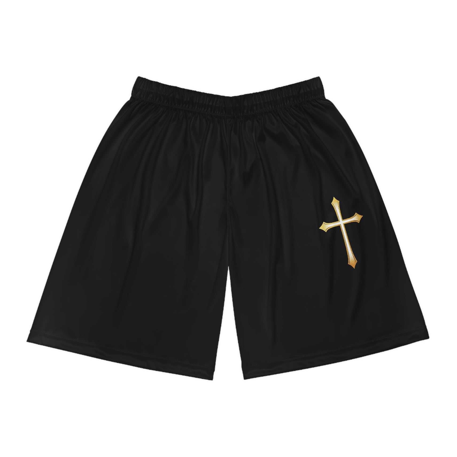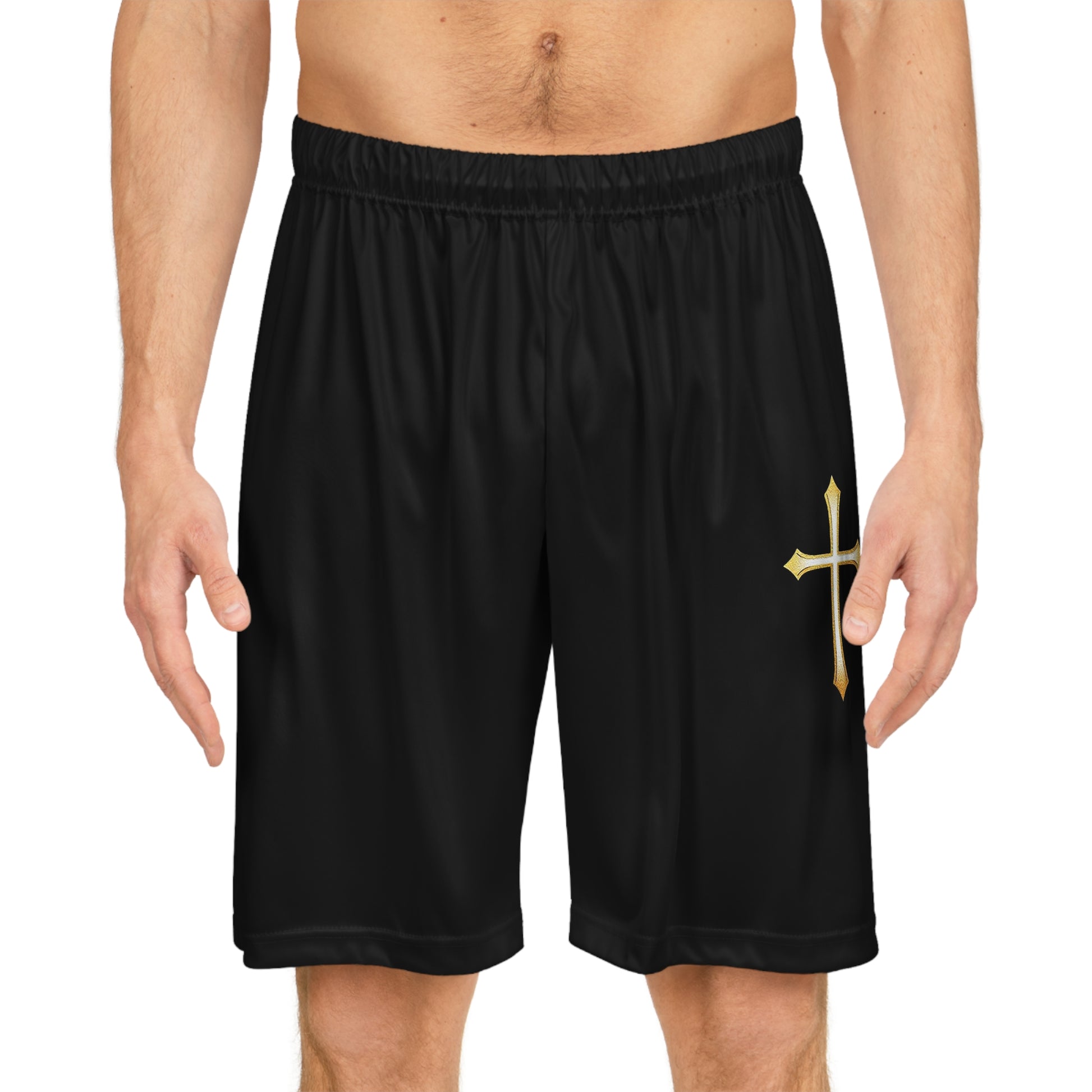 Men’s Modern Gold Cross Basketball Shorts in Black – Sleek Faith-Inspired Design
