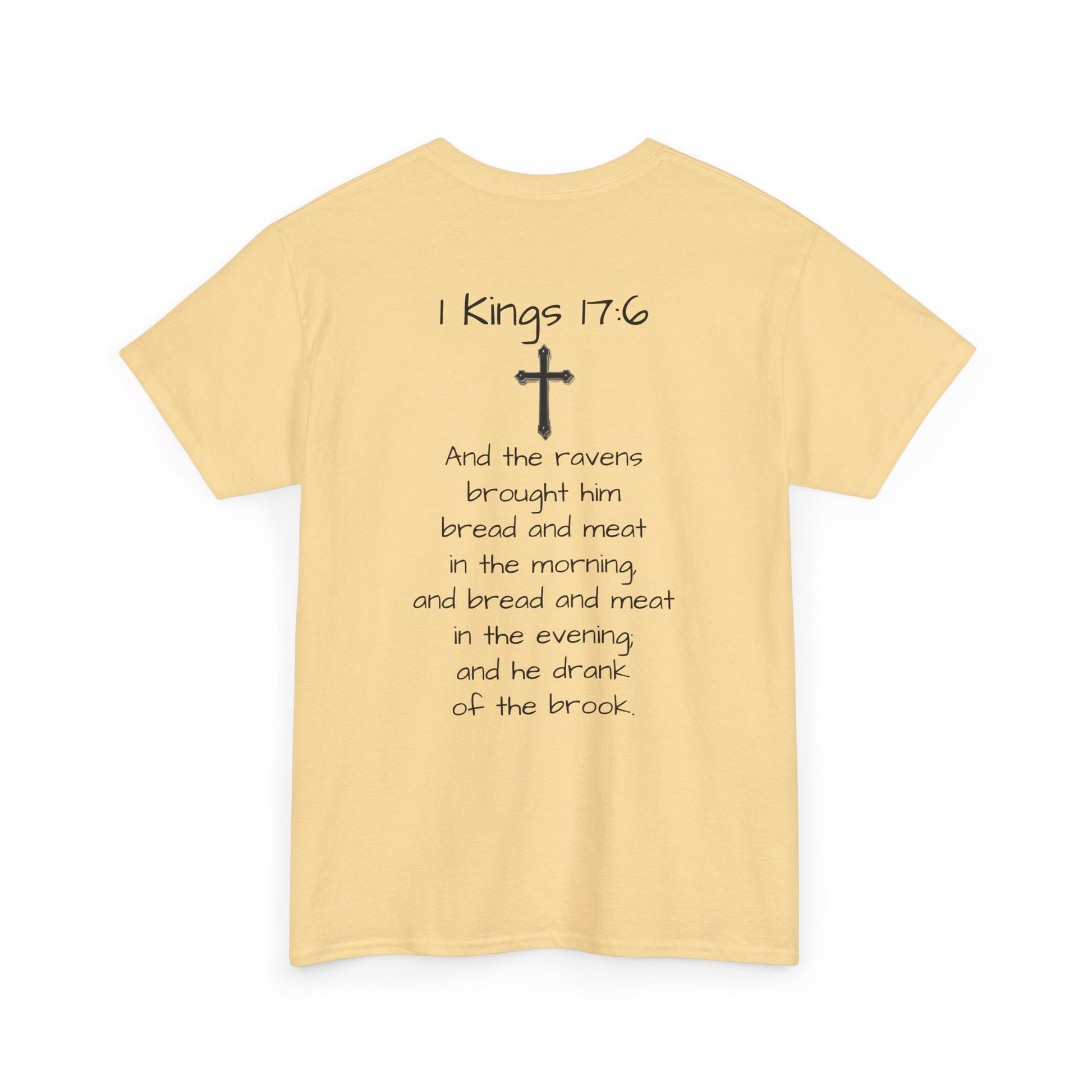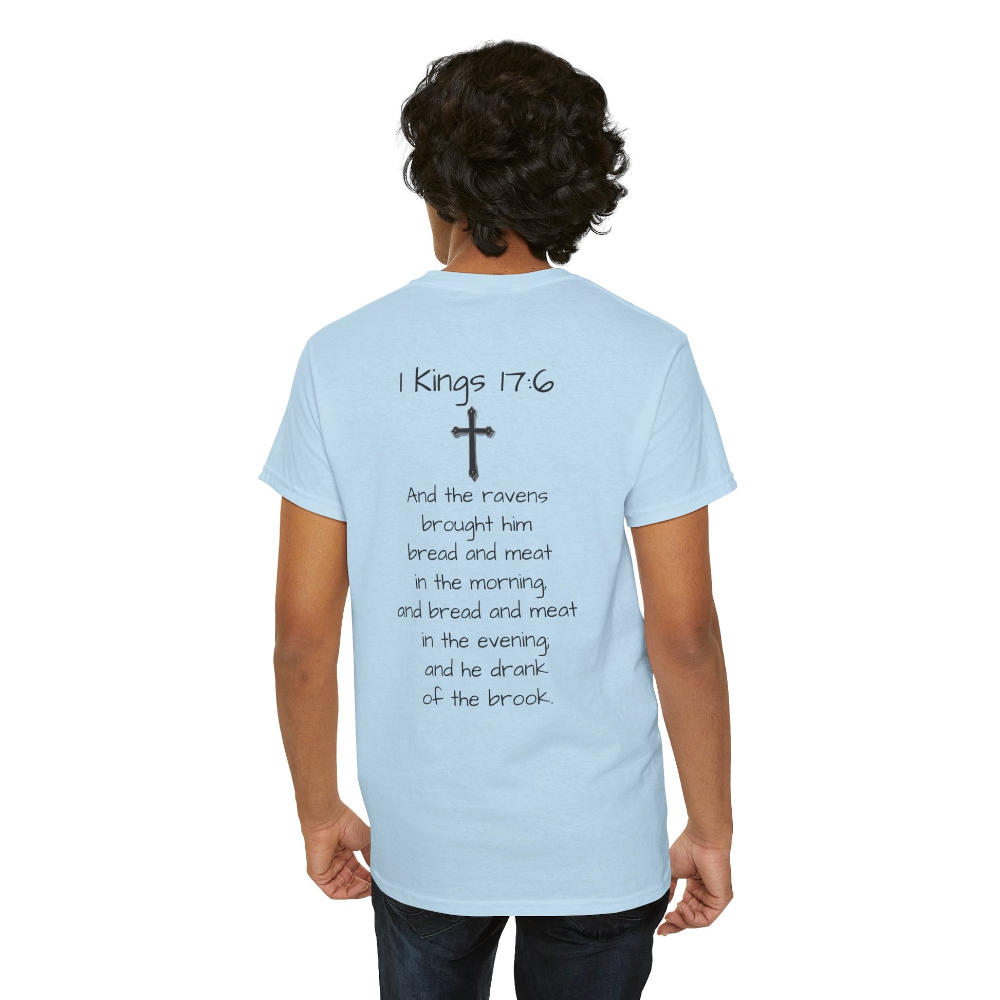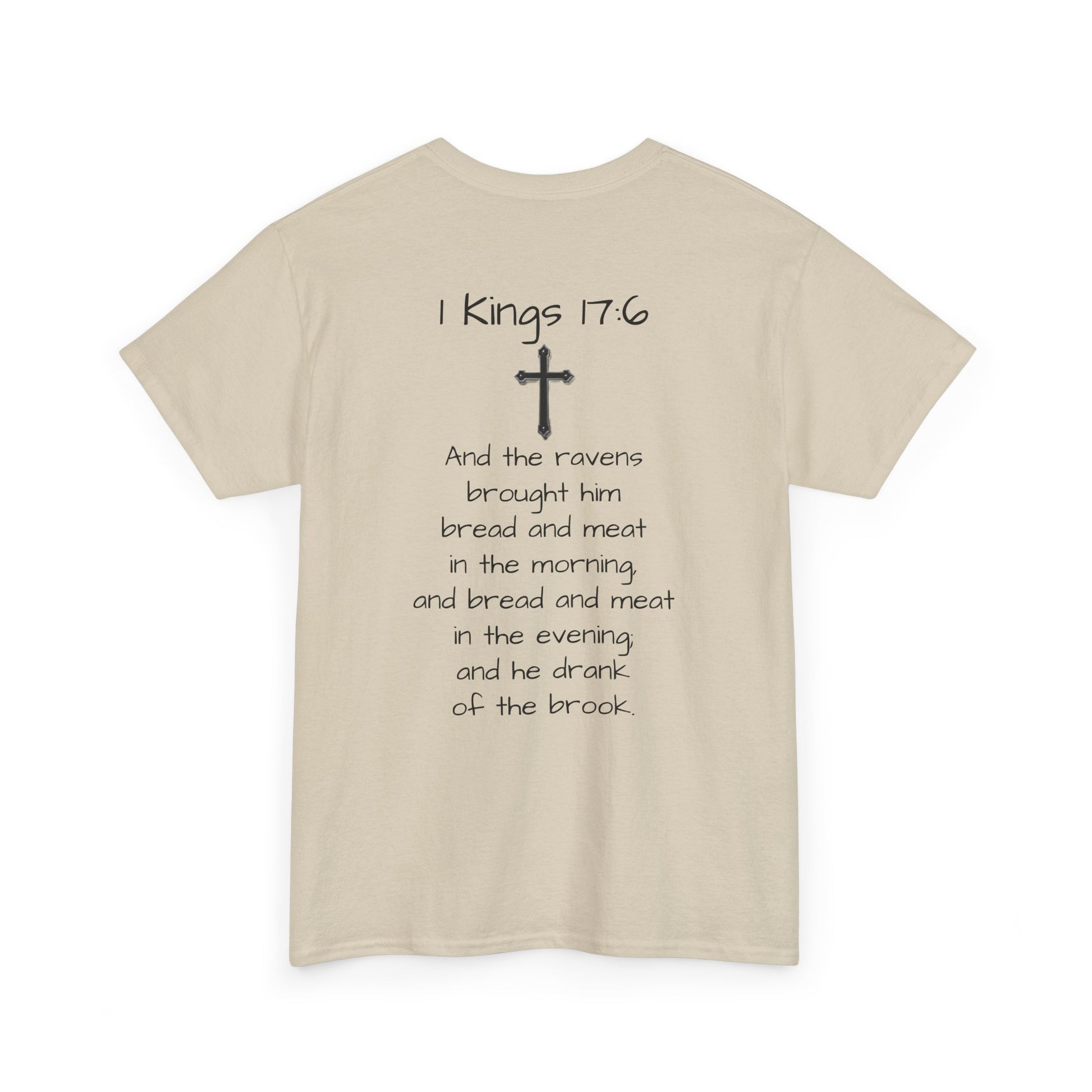 In Scripture, even the ravens were called to serve the will of God — sent to sustain His prophet in the wilderness. This design honors that sacred moment, where obedience and faith met divine provision. The front bears the black cross flanked by two crows — symbols of vigilance, mystery, and unwavering service to the Most High. On the back, the words of 1 Kings 17:6 stand as a testimony to God’s faithful care, even in barren places. A bold statement of faith for those who know that nothing in creation moves without His command.
