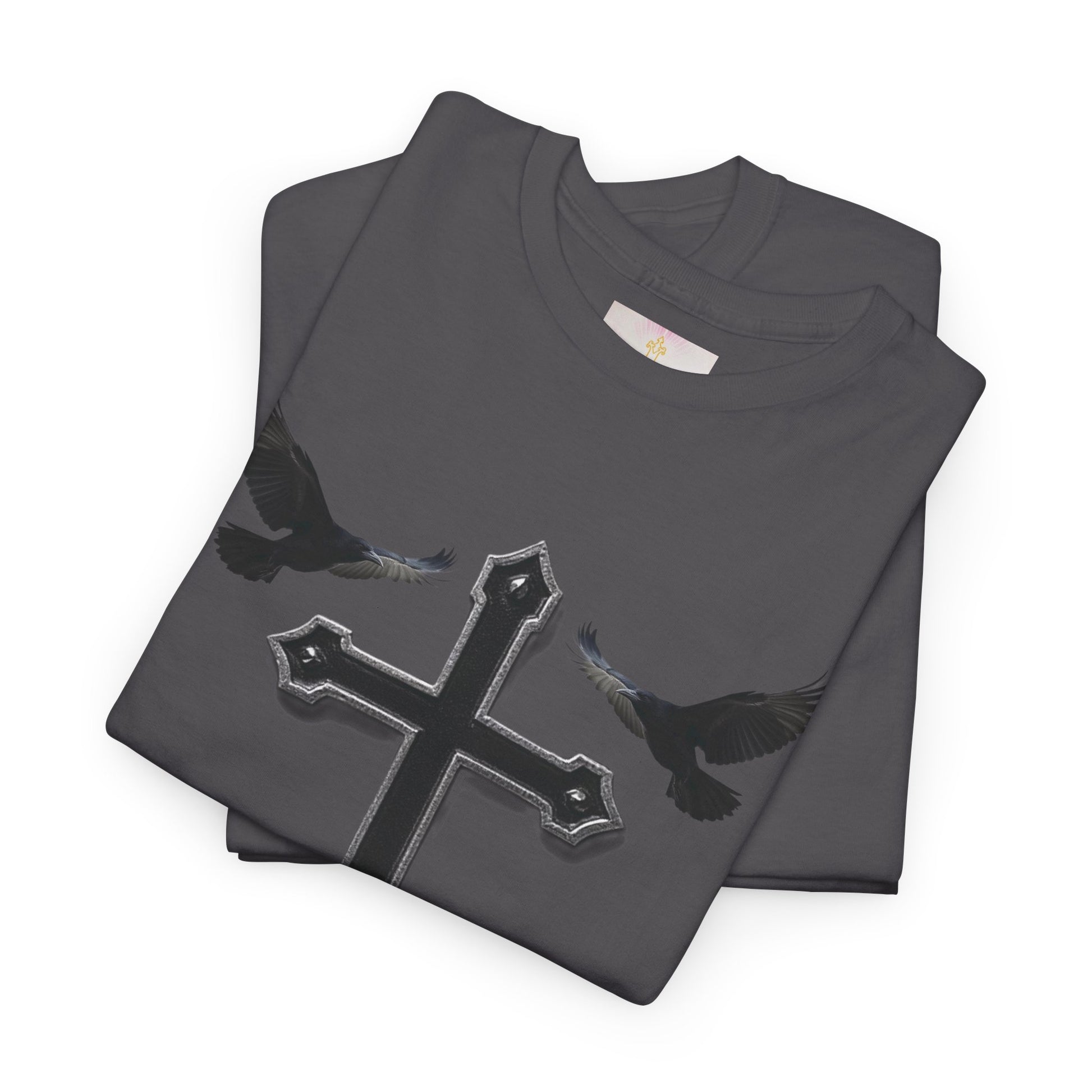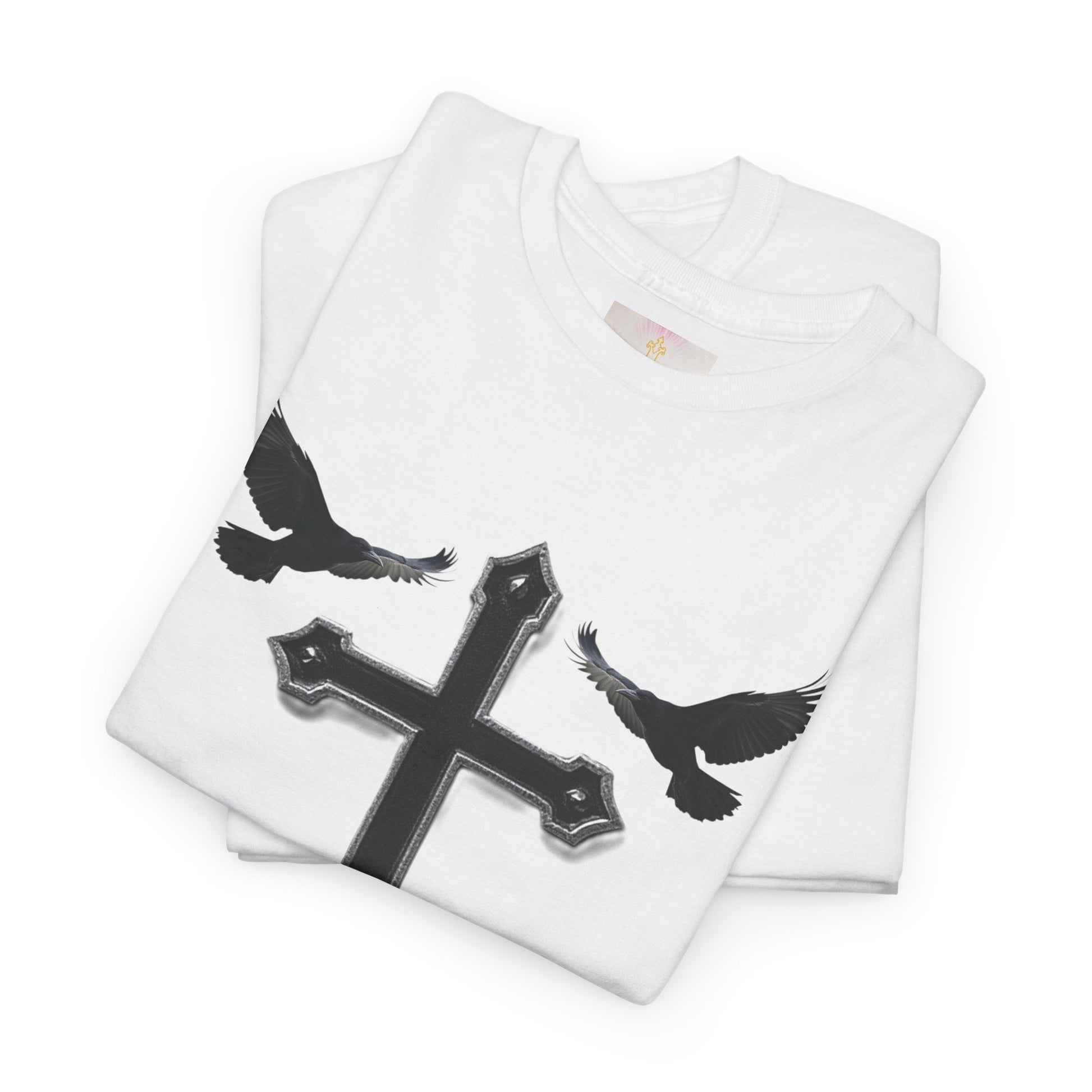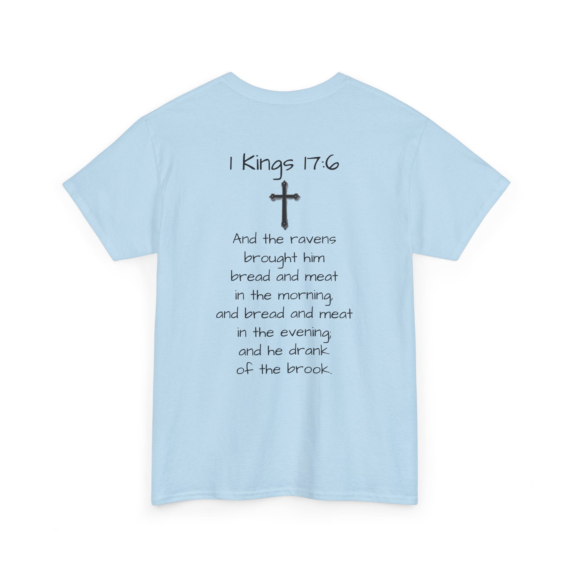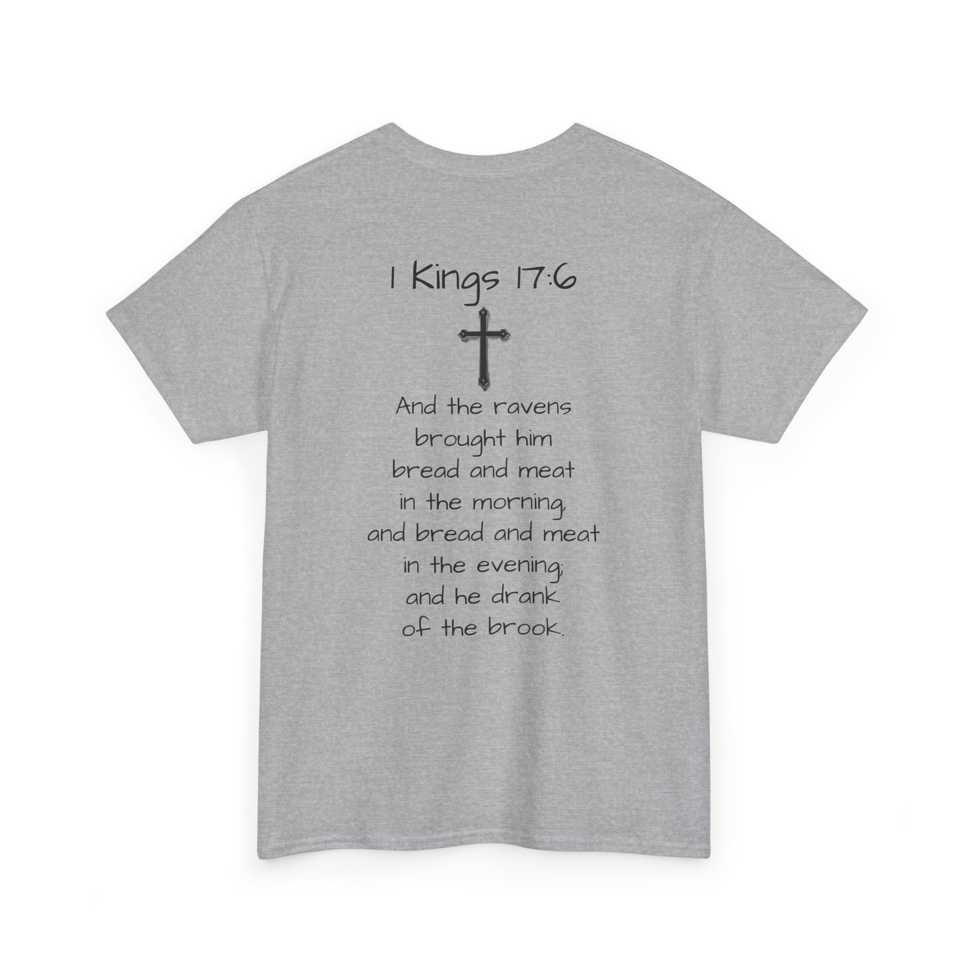 In Scripture, even the ravens were called to serve the will of God — sent to sustain His prophet in the wilderness. This design honors that sacred moment, where obedience and faith met divine provision. The front bears the black cross flanked by two crows — symbols of vigilance, mystery, and unwavering service to the Most High. On the back, the words of 1 Kings 17:6 stand as a testimony to God’s faithful care, even in barren places. A bold statement of faith for those who know that nothing in creation moves without His command.