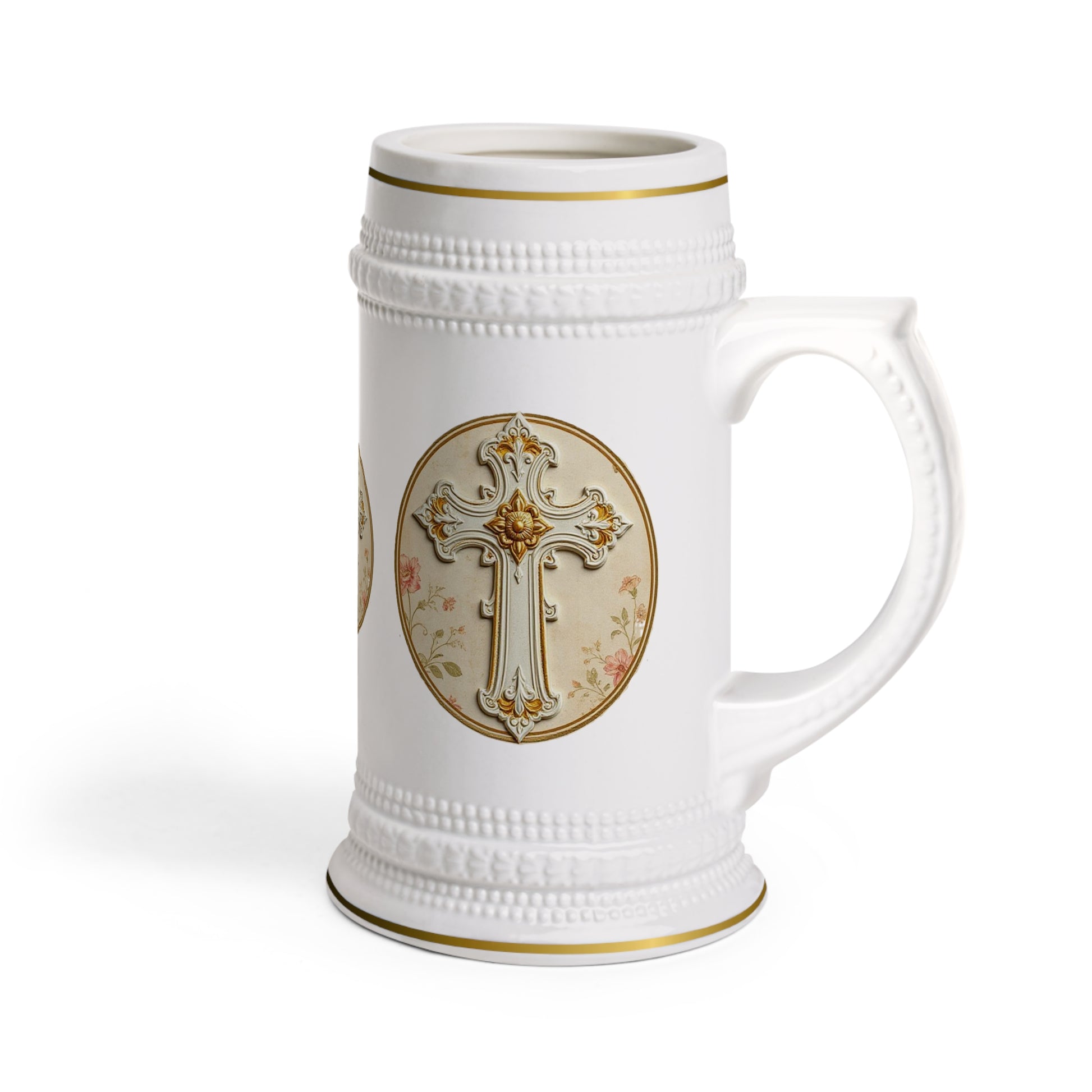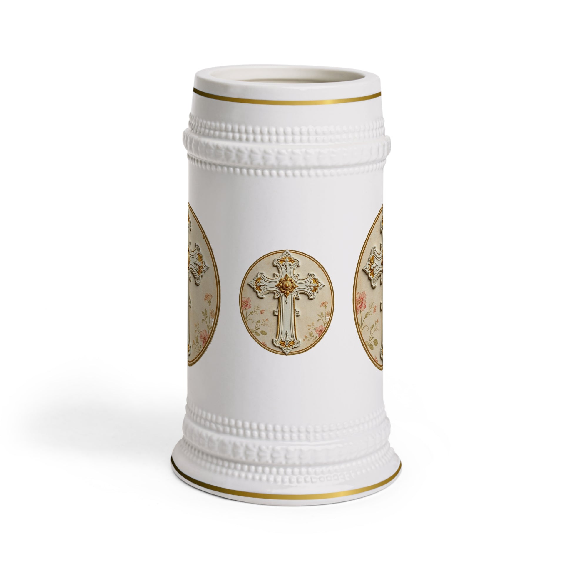 Raise your drink in faith with this striking stein featuring a gold cross on all three sides, designed to look embossed for a rich, dimensional effect. Perfect for coffee, tea, or any beverage, it’s a powerful reminder of God’s presence and love in every sip.