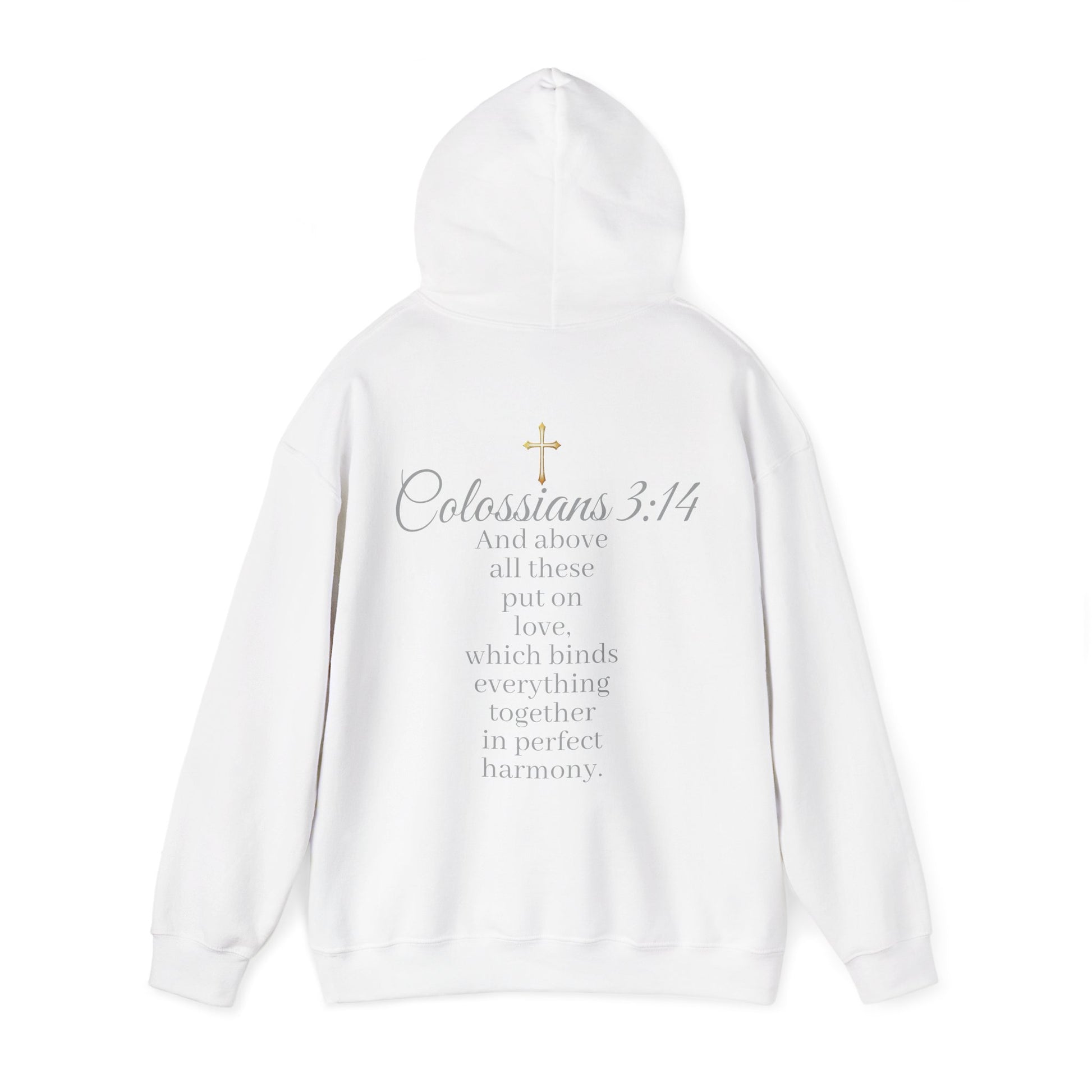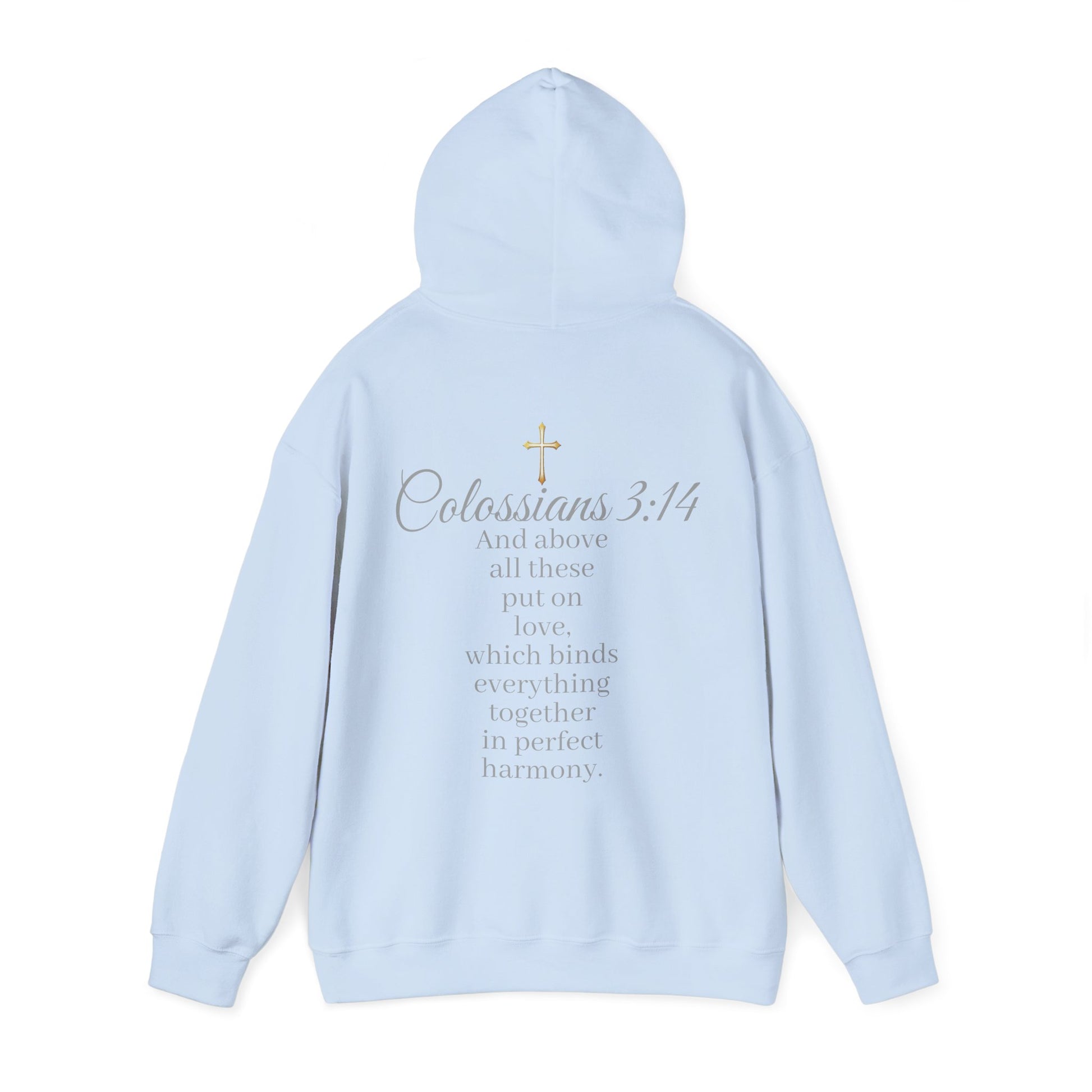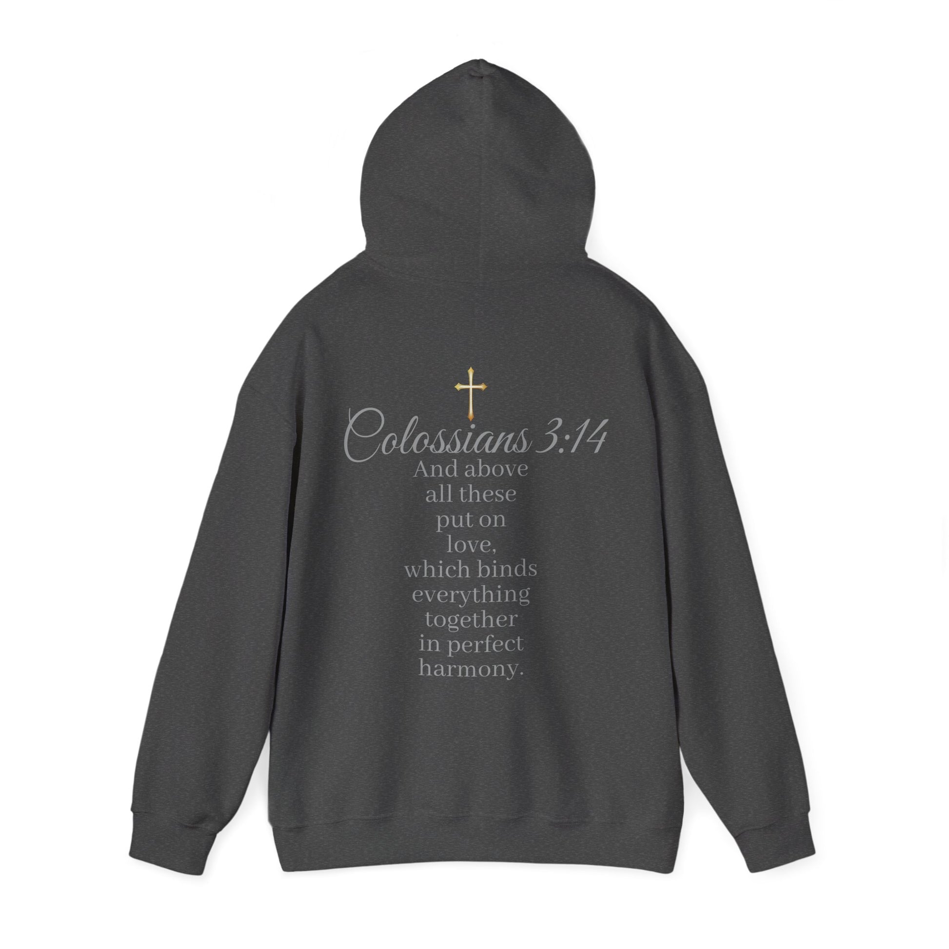 Wrap yourself in warmth and the love of Christ. This hoodie features Colossians 3:14—"And above all these put on love, which binds everything together in perfect harmony."—a reminder that true beauty begins with faith and love. Ideal for casual days, devotionals, or staying cozy with purpose.