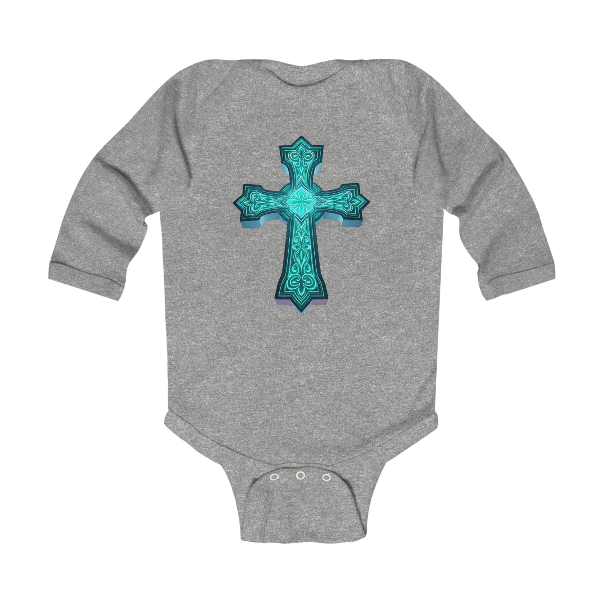 Wrap your little one in warmth and the radiant light of faith with this soft long sleeve infant onesie, featuring a luminous cross on the front. A symbol of divine presence and protection, the glowing cross serves as a gentle reminder that even the smallest among us are held in God’s loving light. Whether it’s nap time, playtime, or a cozy outing, this onesie keeps your child snug in both comfort and spiritual grace. Made from soft, breathable fabric with easy snap closures for convenience and peace of mind.
