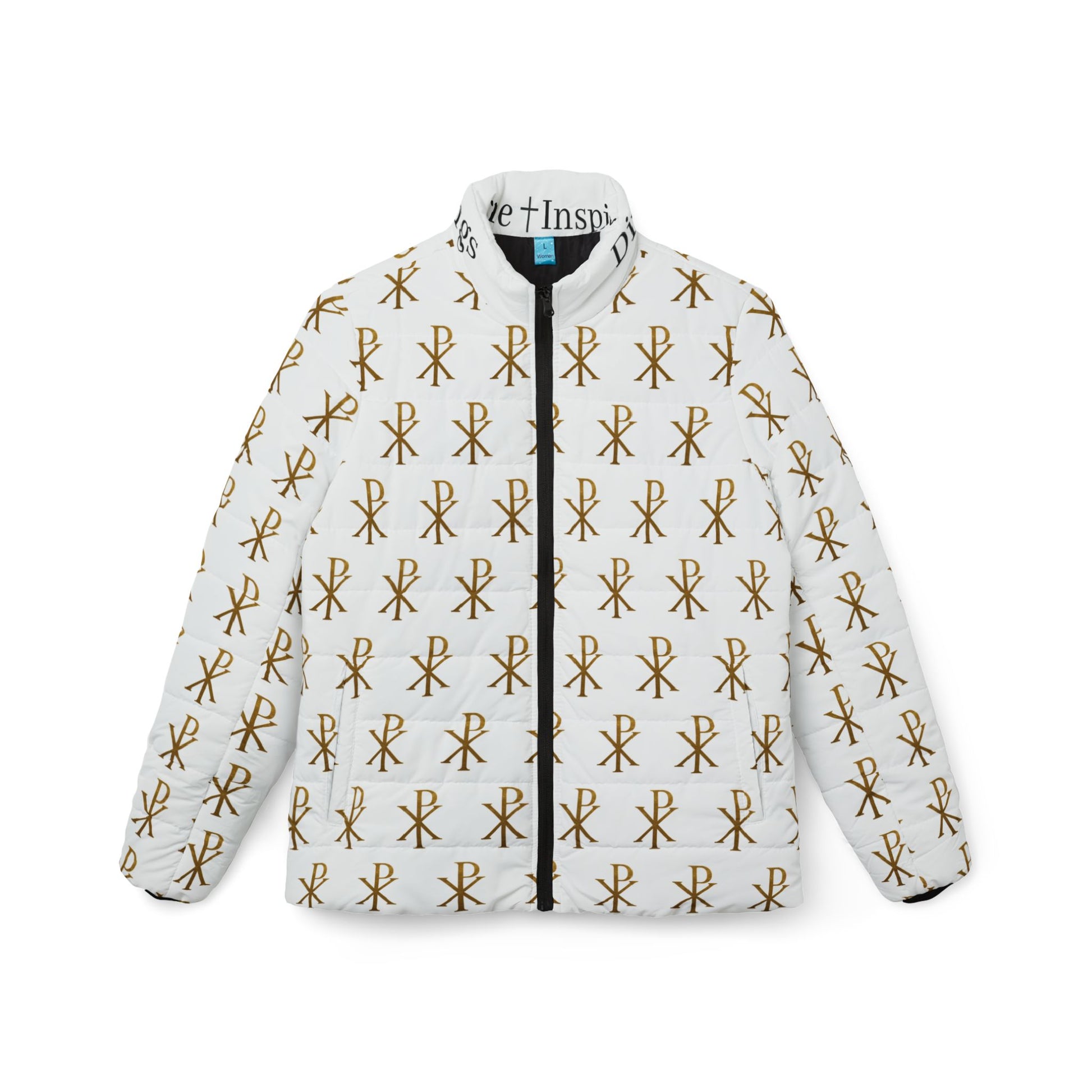 Radiant Victory Women’s Puffer Jacket – Gold Chi Rho Pattern