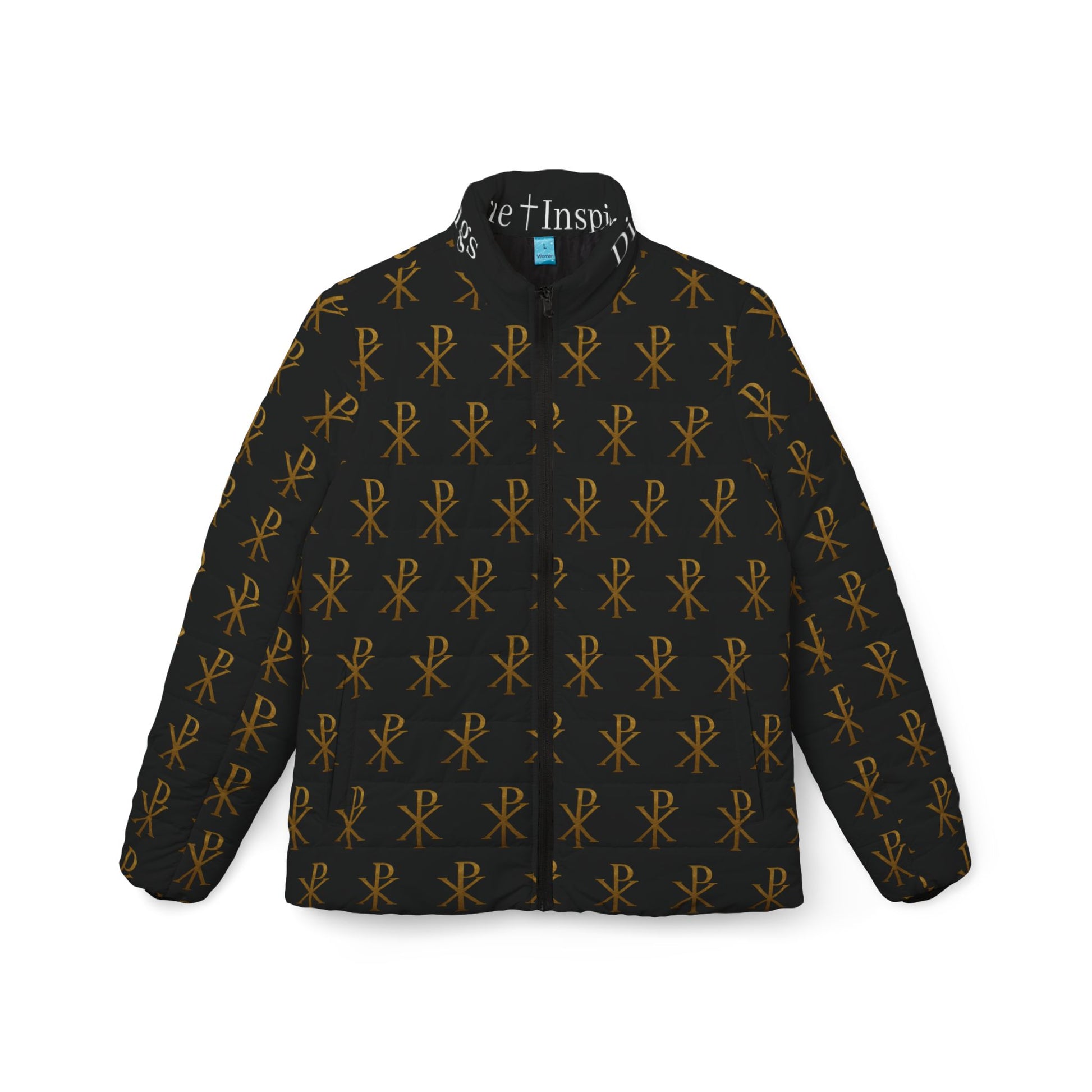 Radiant Victory Women’s Puffer Jacket in Black – Gold Chi Rho Pattern