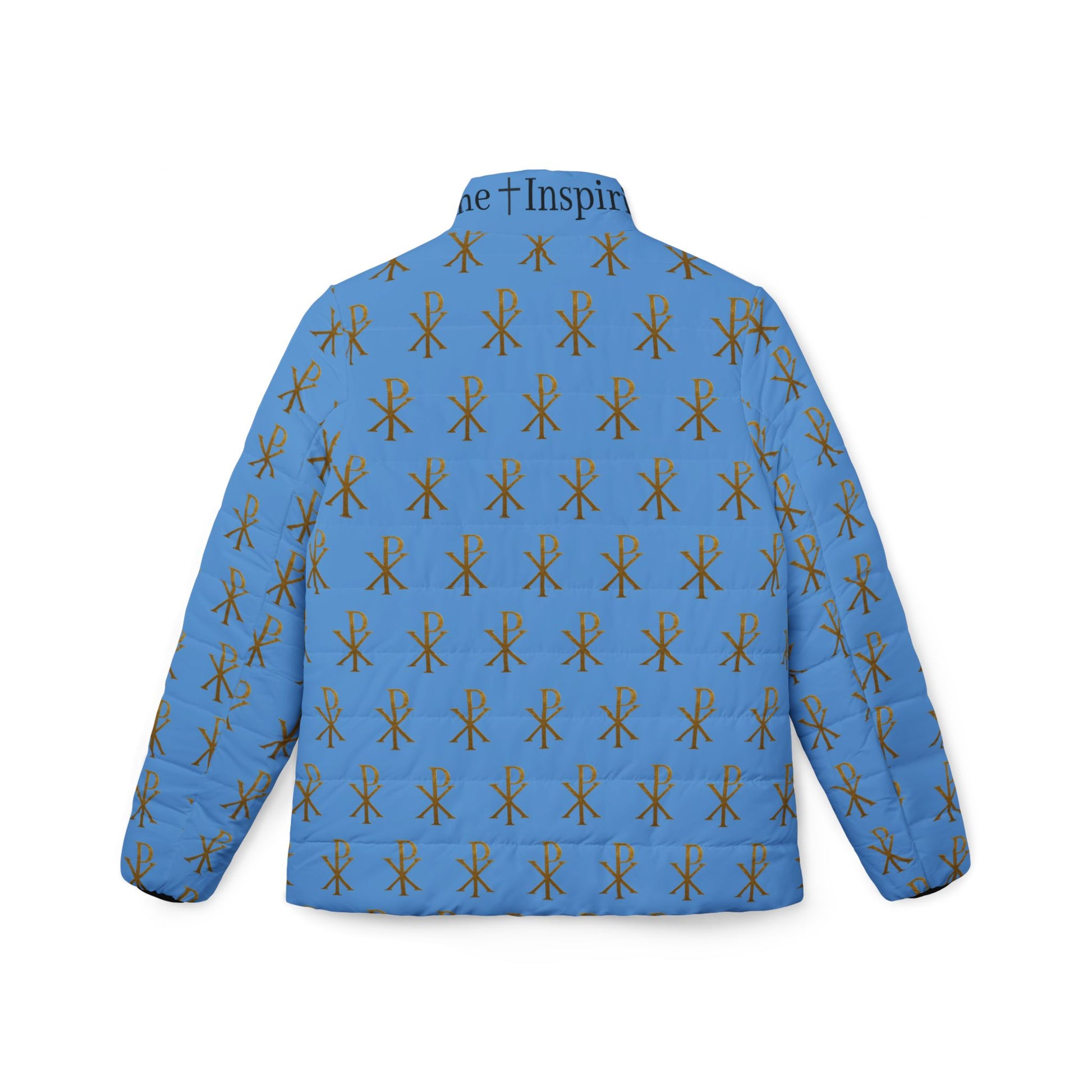 Radiant Victory Women’s Puffer Jacket in Blue – Gold Chi Rho Pattern