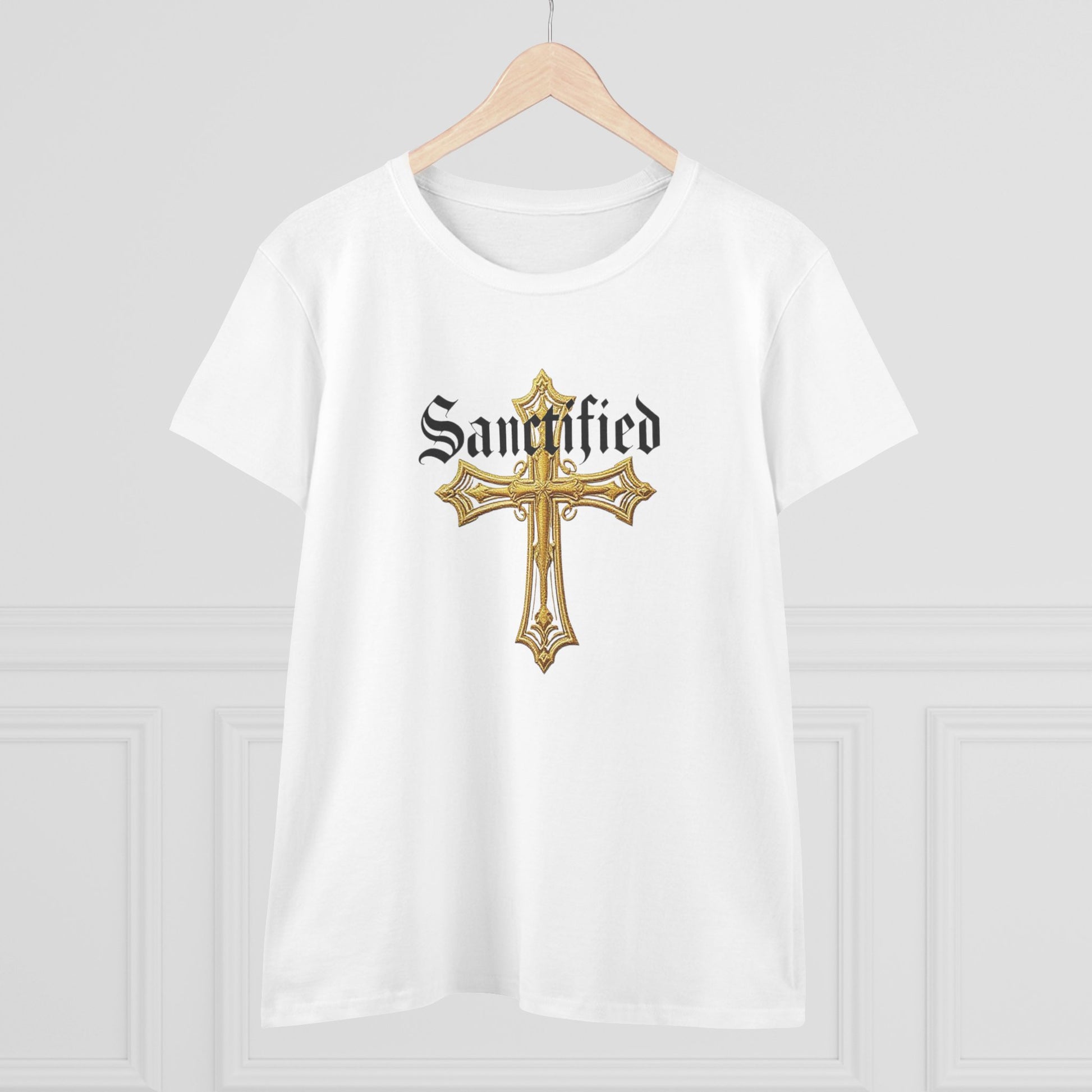 Step into faith with elegance in this women’s Christian T-shirt. Featuring Sanctified in striking black gothic lettering over an ornate gold cross, this design combines timeless devotion with modern style. Perfect for everyday wear, church gatherings, or moments of reflection, it lets your faith shine boldly and beautifully. A thoughtful gift for Christian women seeking apparel that reflects their sanctified walk with confidence and grace.