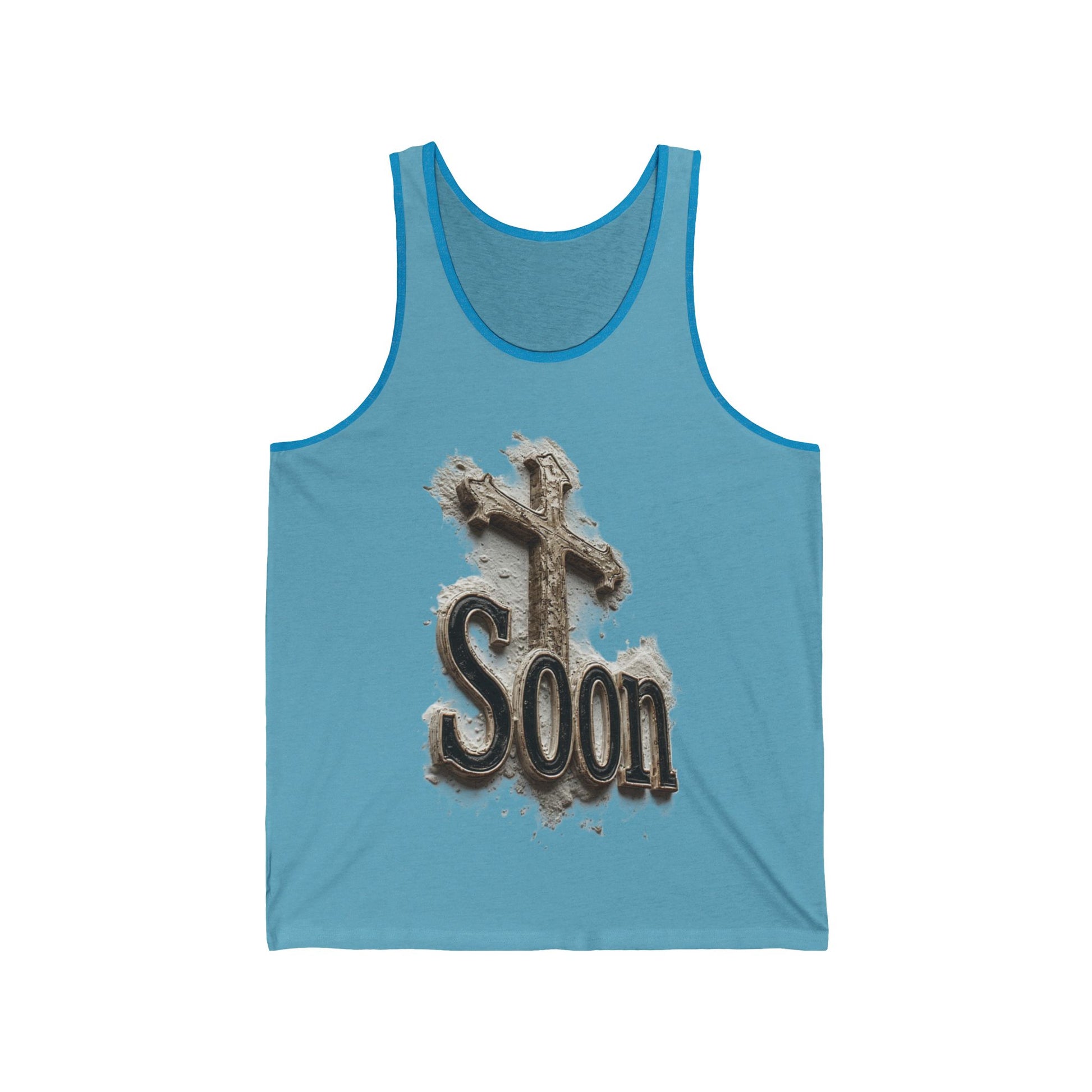 Show your faith and anticipation wherever you go with this “Soon” Cross Tank. The design of a cross emerging from sand and stone symbolizes the believer’s confident hope in Jesus’ imminent return. Lightweight and comfortable, this tank is perfect for warm days, workouts, or layered with your favorite hoodie. Let your attire reflect the joyful expectation of our Savior’s coming and inspire those around you.