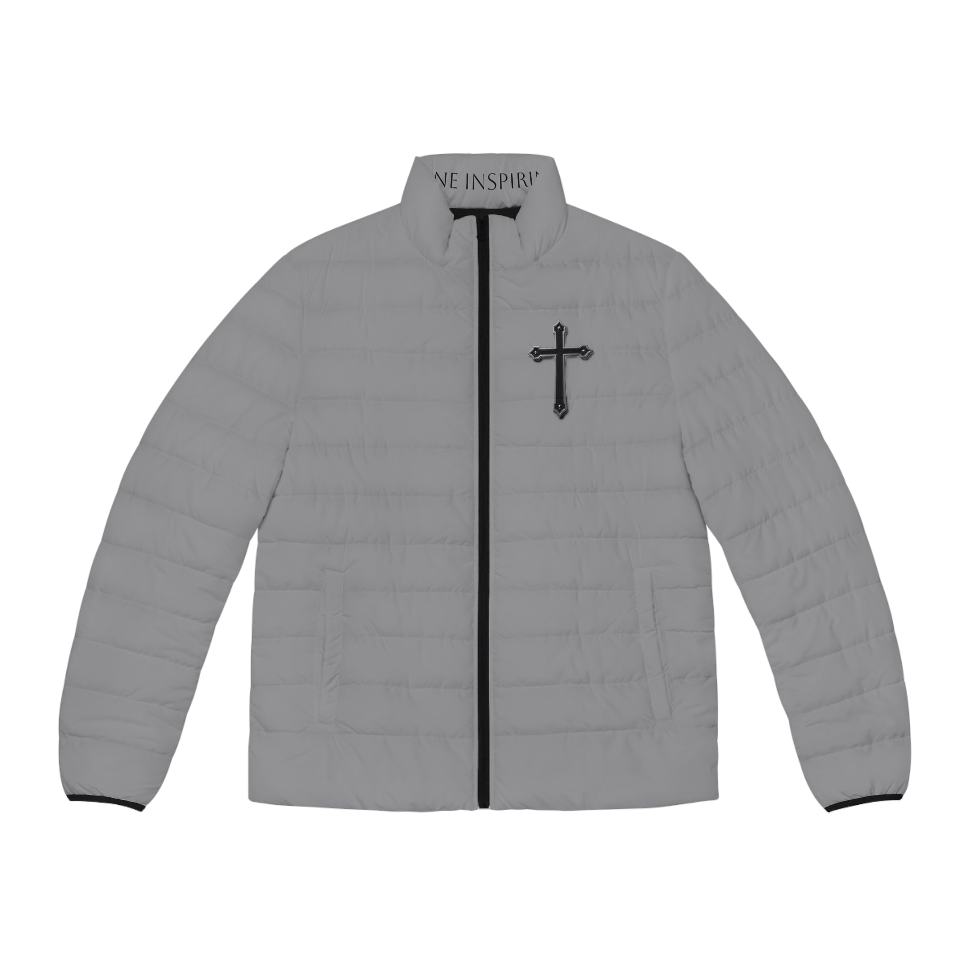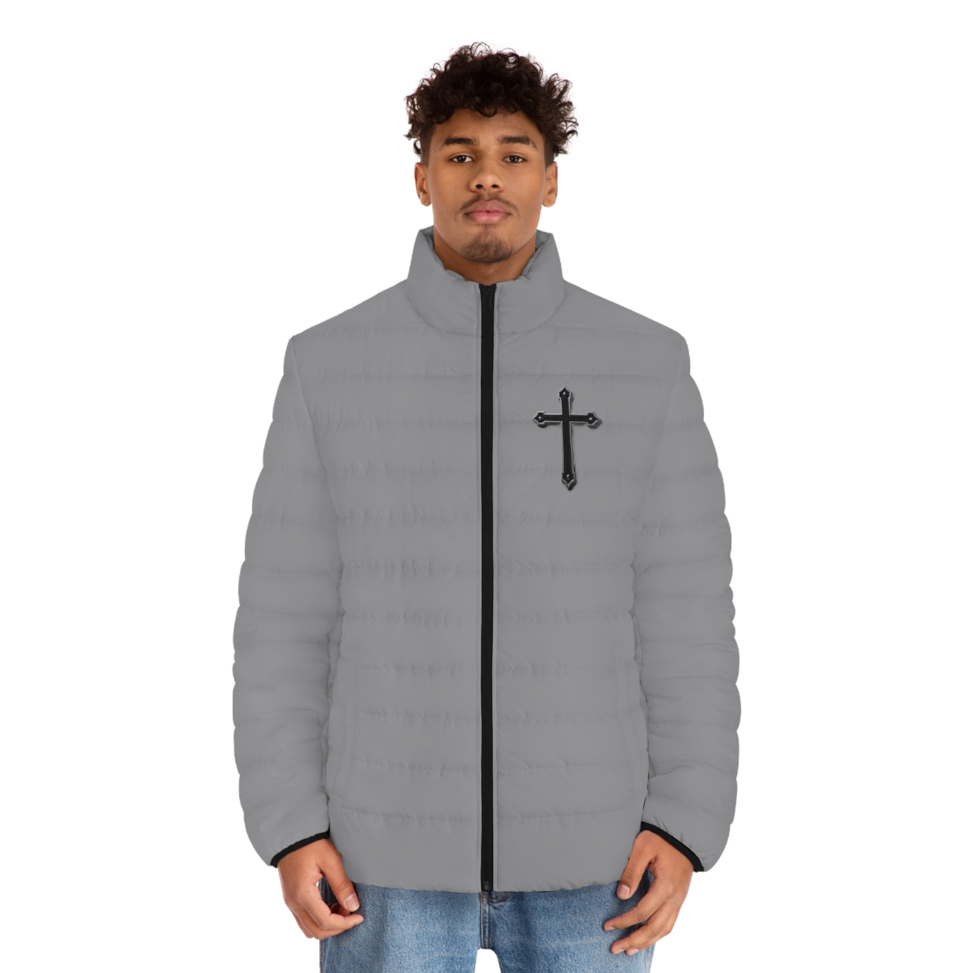 Steadfast Faith Men’s Puffer Jacket in Grey – Black Cross Crest