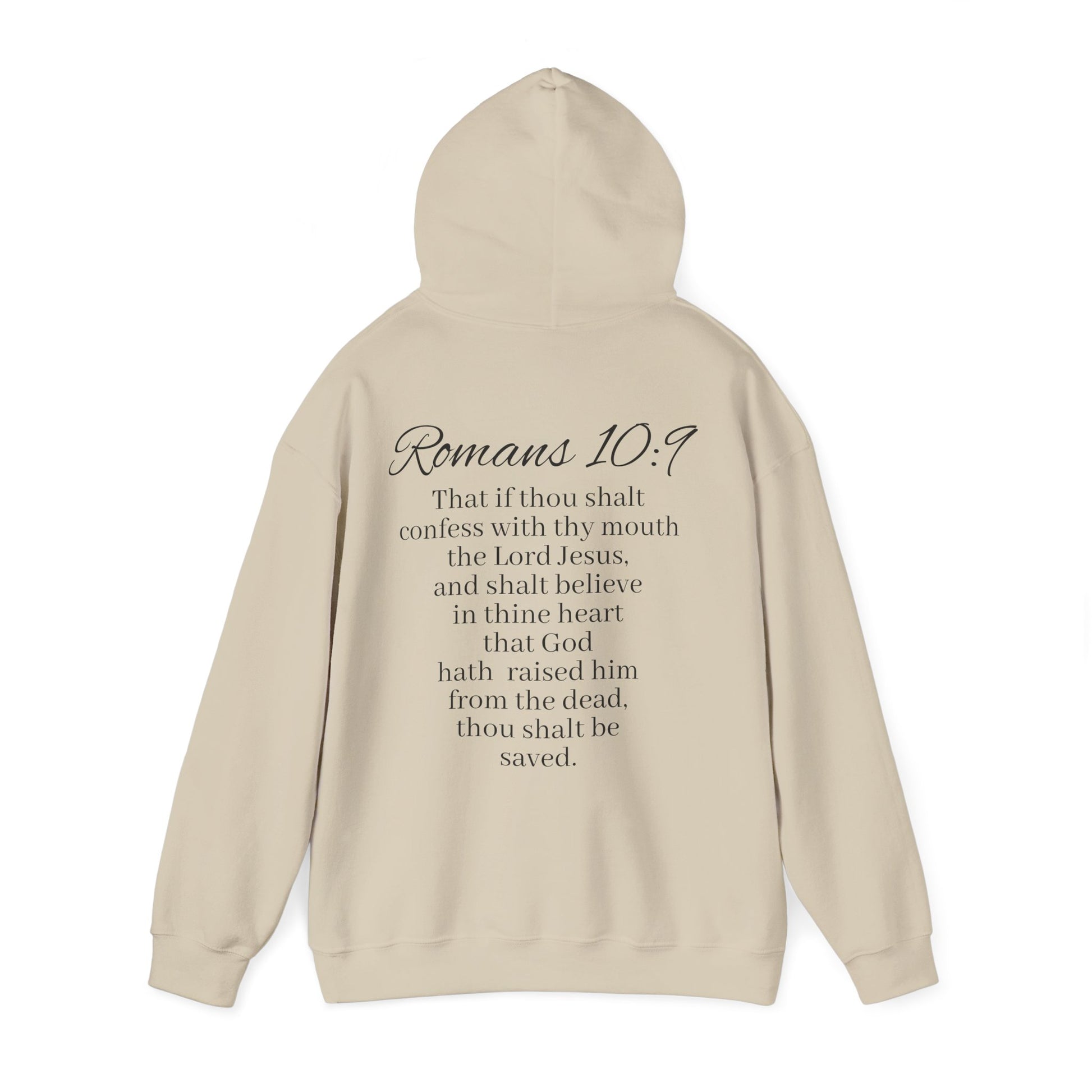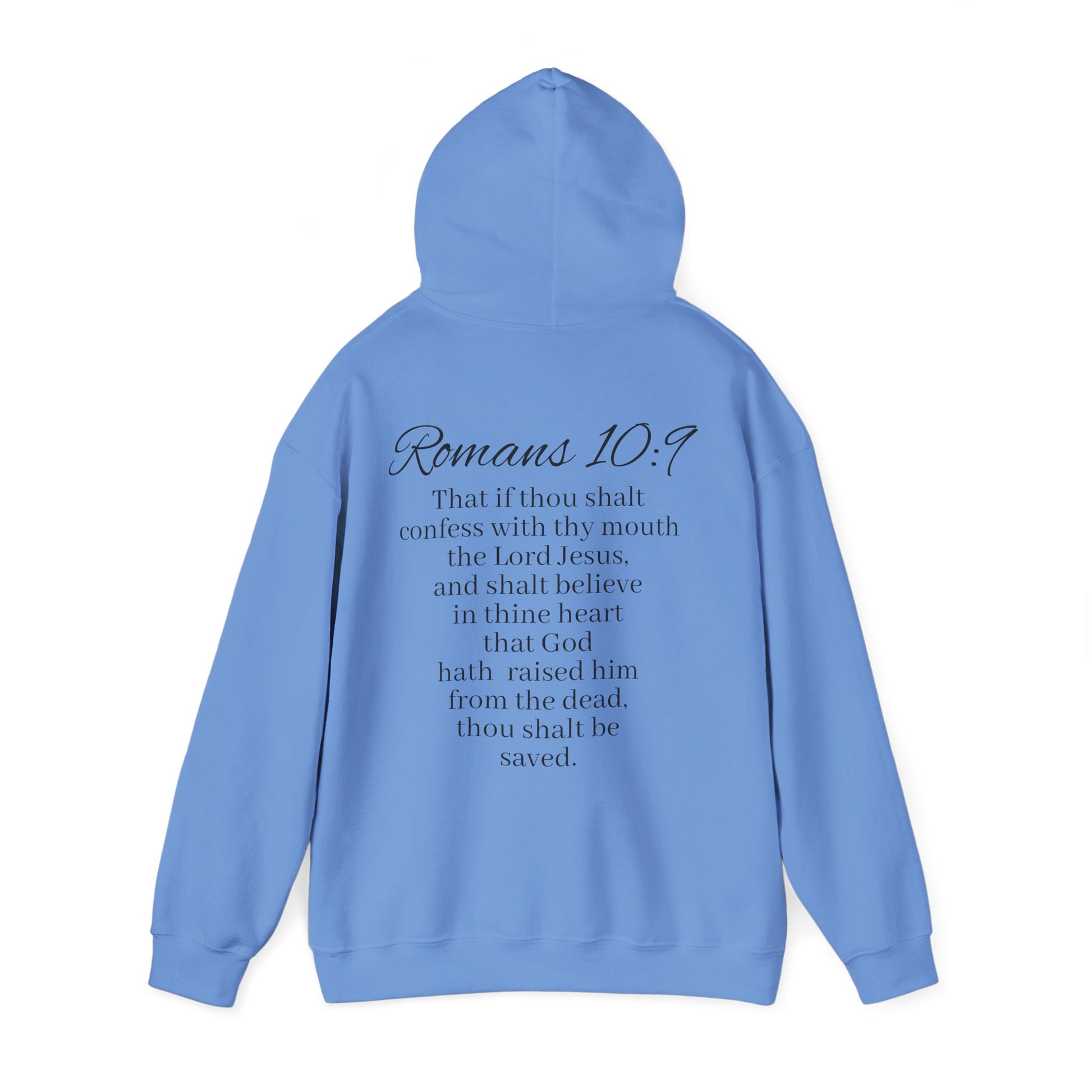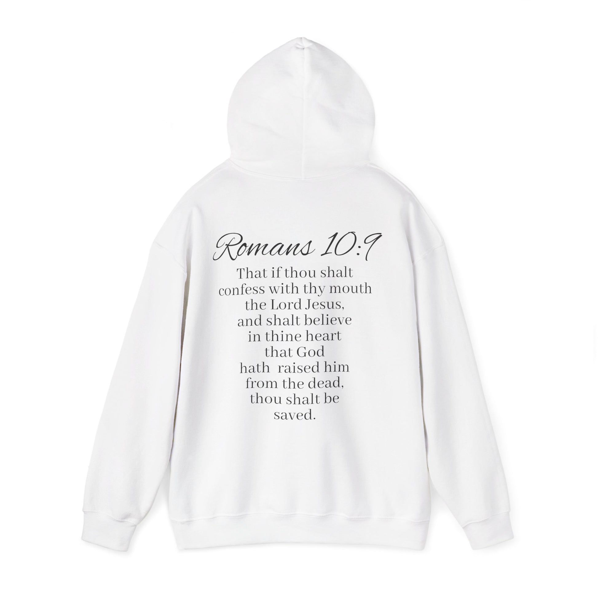 Stay warm and faith-filled in this women’s Christian hoodie. The front features Believe with praying hands—a simple but powerful reminder to place your trust in God. On the back, Romans 10:9 is displayed in full, declaring the promise of salvation through faith in Christ: “If you declare with your mouth, ‘Jesus is Lord,’ and believe in your heart that God raised him from the dead, you will be saved.”
