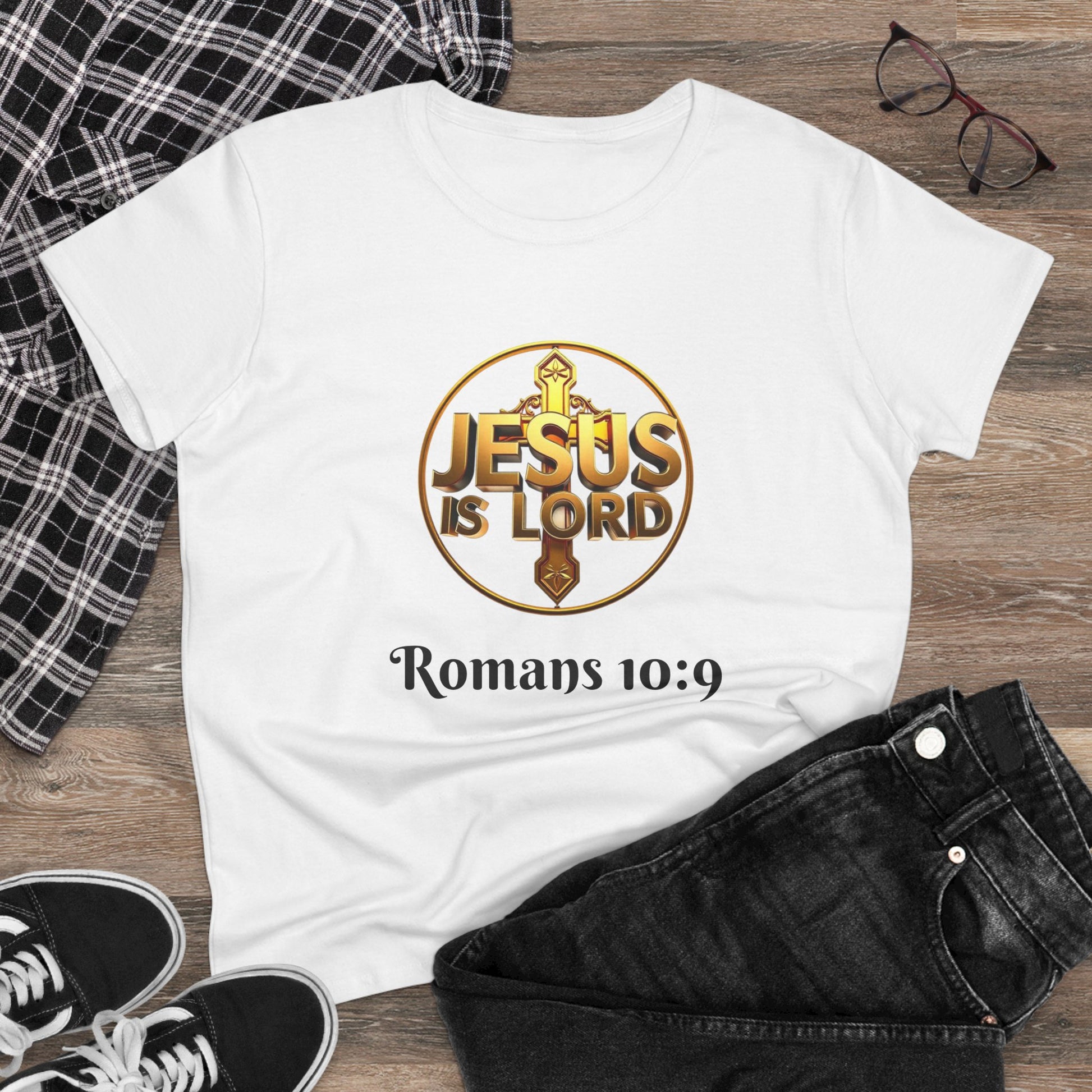 Women’s Romans 10:9 Christian T-Shirt – Jesus Is Lord & He Is Risen (Dark Lettering)